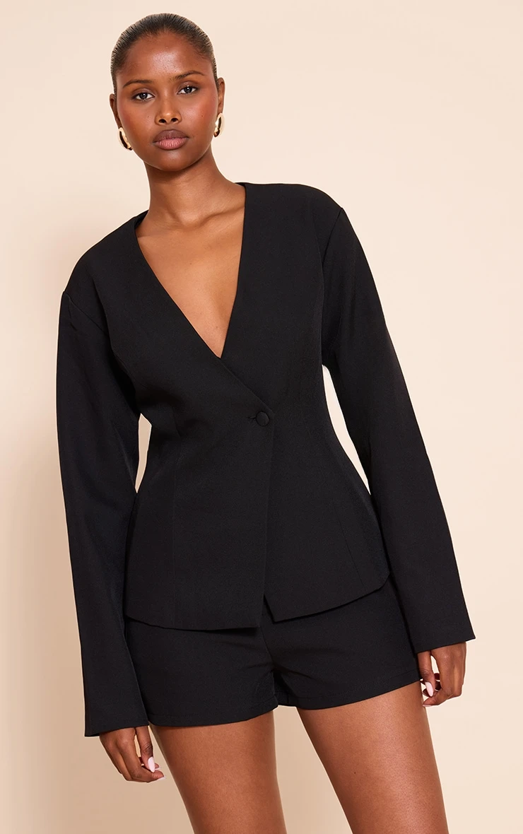 Keep it classic in this black tailored cinched waist asymmetric blazer. Brought to you in black material with a flattering cinched waist and an asymmetrical value fastening, it’s the perfect sophisticated finishing touch to your look. Pair it with the matching shorts, barely-there heels and minimalistic jewelry for a versatile outfit.