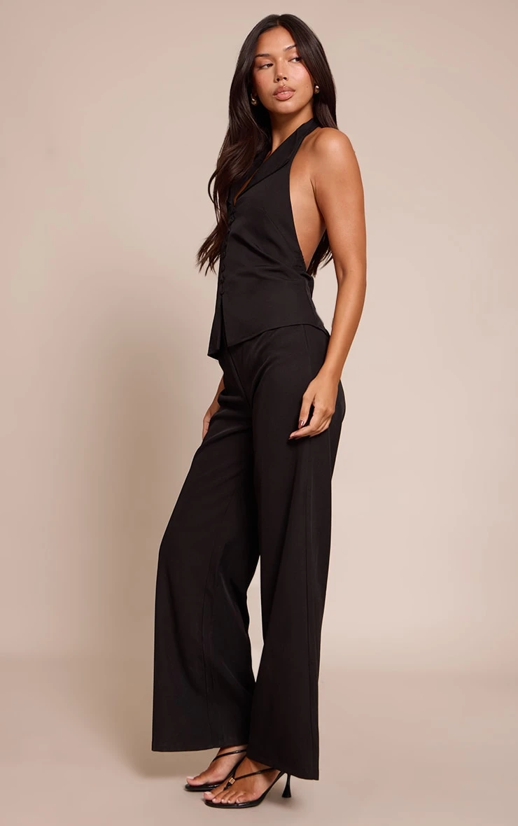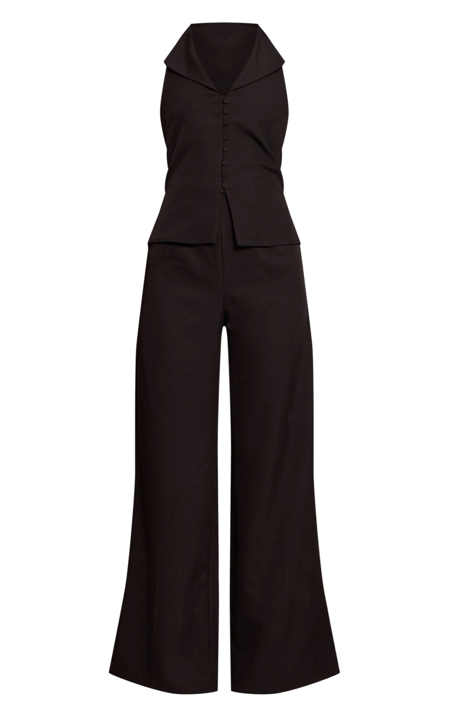 Bring sleek tailoring to your wardrobe with this black vest straight leg jumpsuit. Featuring a vest-style top with value-down detailing, a cinched waist, and a streamlined straight leg fit, this piece is all about understated elegance. Perfect for dressing up or down, style with strappy heels and a bold red lip for evening glam, or layer with an oversized blazer and loafers for chic daytime tailoring.