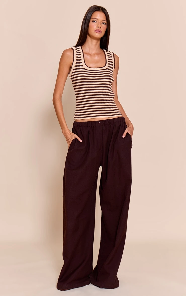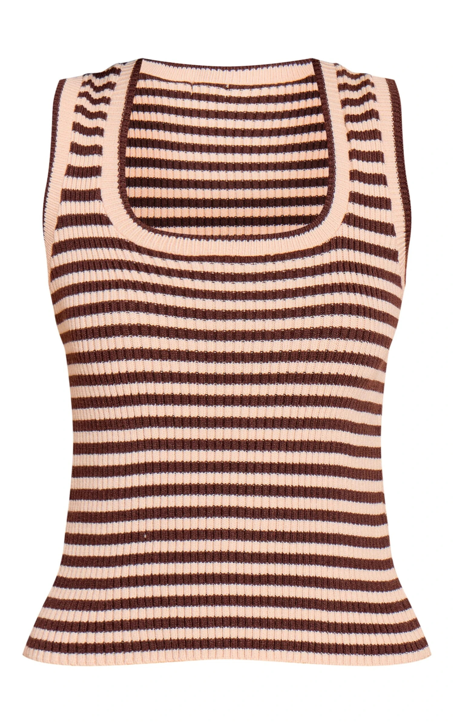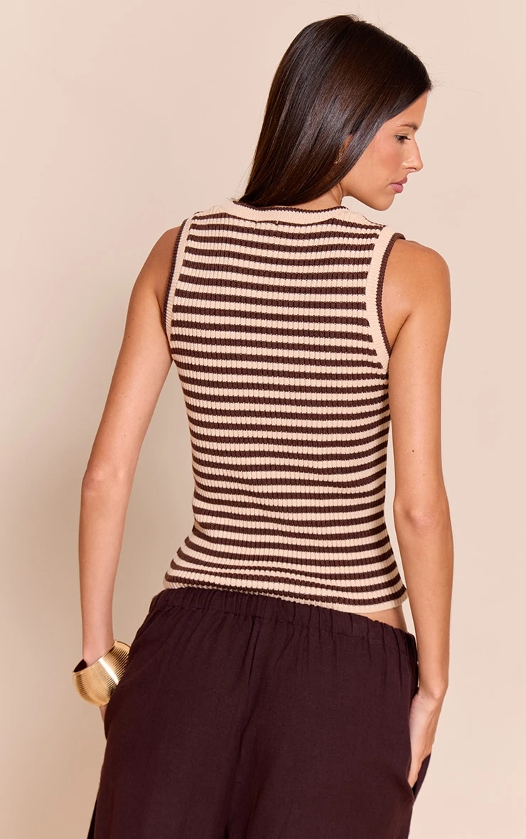 The brown scooped neck striped rib knit vest is a casual staple with an elevated finish. Featuring subtle ribbed texture and a flattering scoop neckline, it layers seamlessly under shirts or pairs easily with denim for a low-key look.