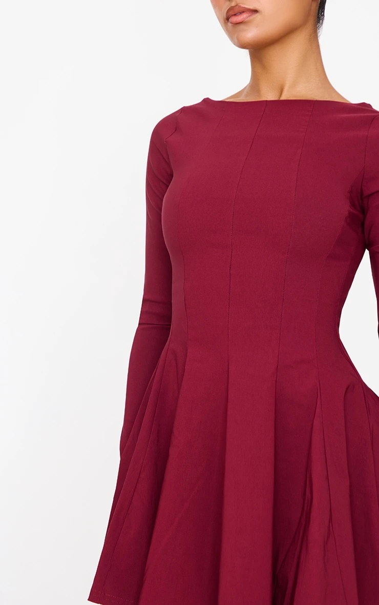 Meet your new season style staple, this burgundy stretch woven boat neck long sleeve pleated shift dress. Brought to you in a burgundy stretch woven material with a boat neck design, long sleeves and a pleated style, how can you resist? Style this shift dress with heels and gold accessories for a look that is sure to have eyes on you all night long.
