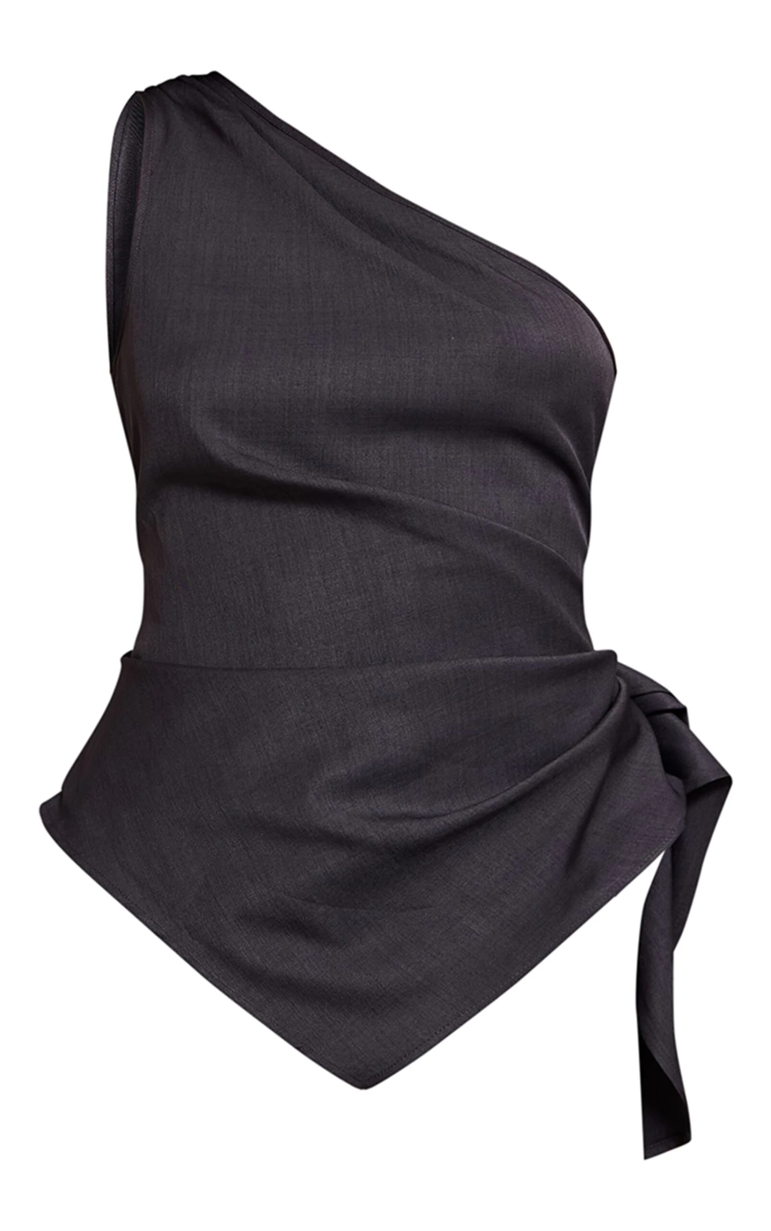 Capture every gaze with an architectural edge. The charcoal woven one shoulder drape detail top presents a confident take on evening wear, showcasing a distinctive one-shoulder neckline that creates an impactful line. Its artful drape detailing cinches and flows, leading to a dynamic asymmetric hem that moves with purposeful confidence. Pair this essential piece with tailored wide-leg pants for a refined silhouette, or elevate it further with a sleek midi skirt and sharp heels for an assured after-dark statement.
