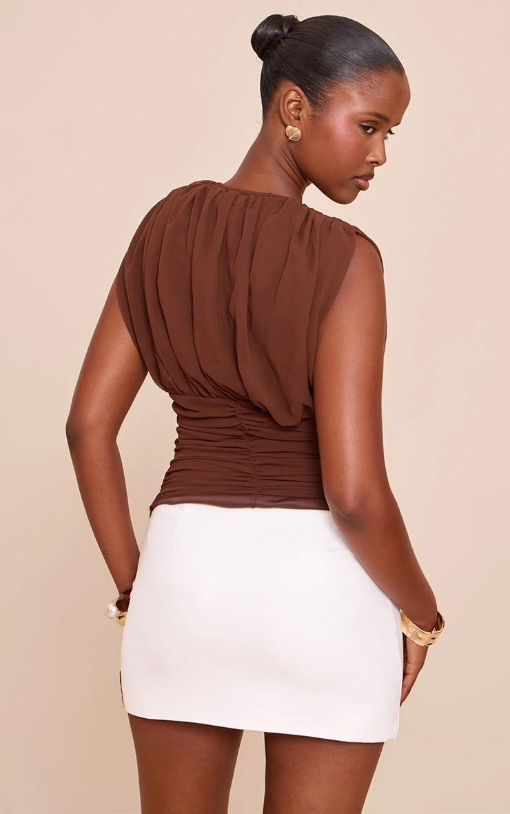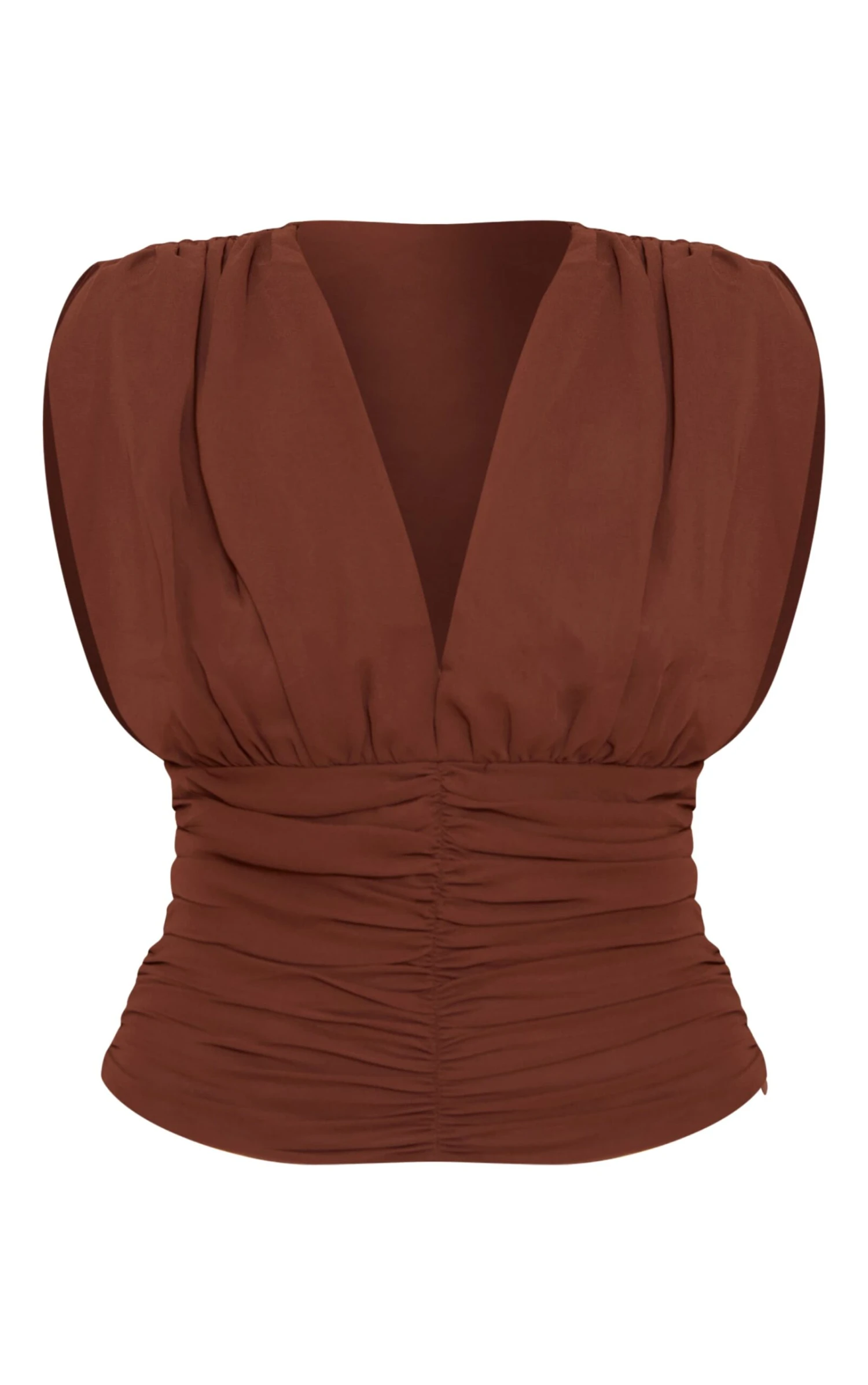 Keep it chic in this chocolate chiffon plunge ruched bodice top. Crafted from chocolate toned chiffon, this top has a plunging neckline, flattering ruching and a sleeveless fit. Team it with a white mini skirt, nude heels and your favorite gold jewelry.