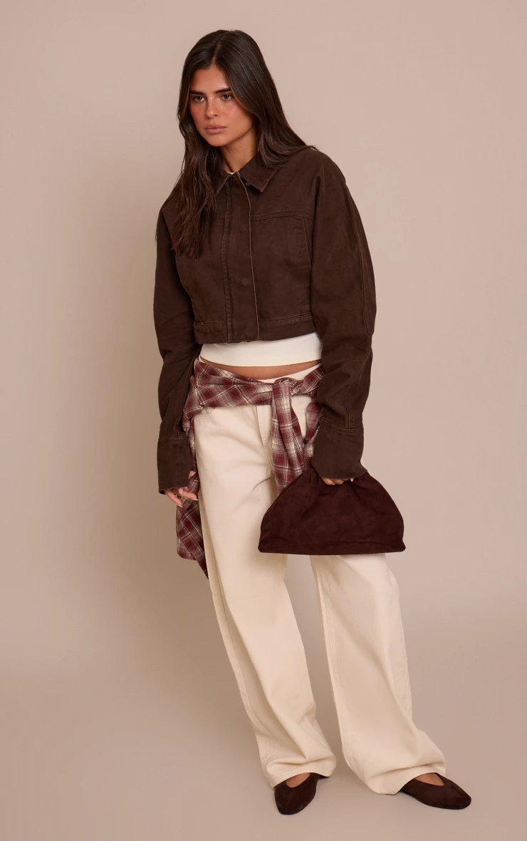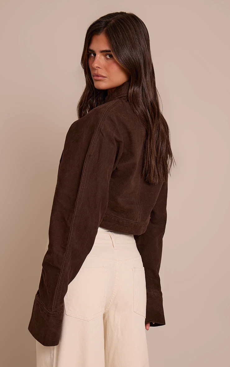 Upgrade your outerwear edit with the chocolate concealed placket denim jacket. The concealed placket and tailored fit give a sleek, modern finish. Layer over a midi dress with ankle boots for a polished daytime look, or pair with pleated pants and heels for elevated casual style.