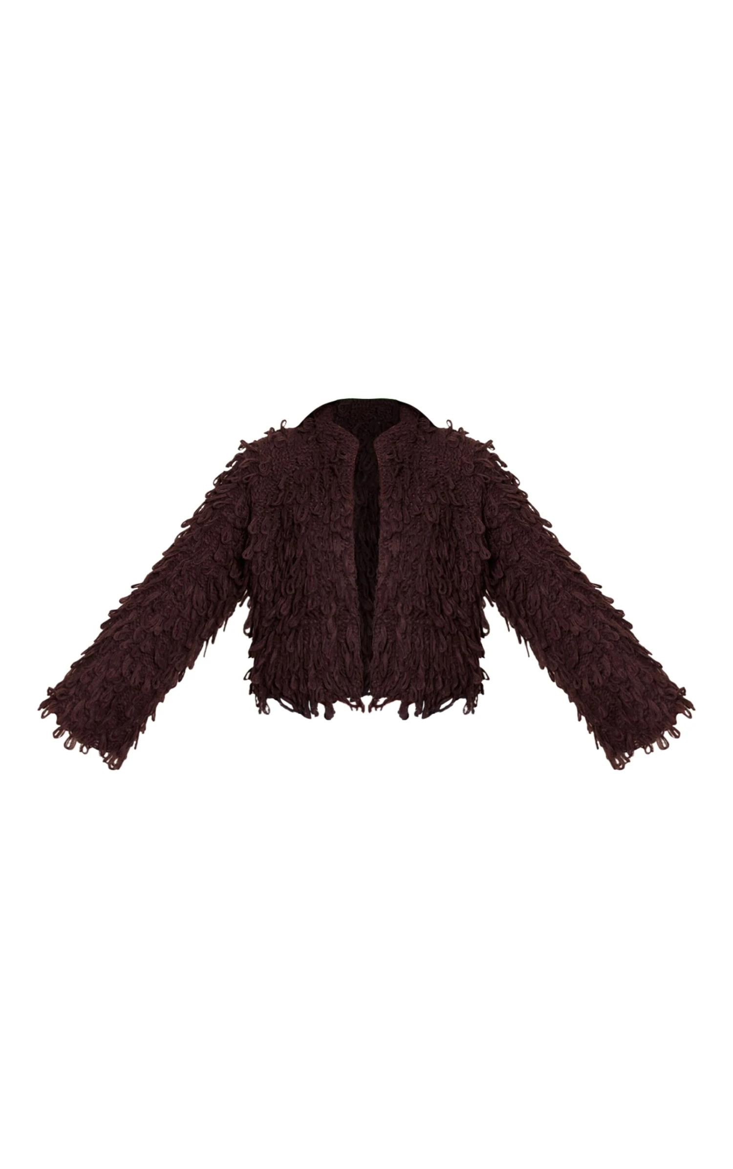 Instant impact comes courtesy of a statement knit. The chocolate loop knit oversized cardigan embraces an artful texture, offering a relaxed yet distinct layer for daywear. Its rich chocolate hue and all-over looped design create a tactile finish, while the open front and cropped cut lend an effortless, contemporary feel. Team this essential piece with wide-leg pants and a simple camisole, finishing the look with sleek flats for an elevated casual aesthetic. Don’t forget subtle gold earrings to complete this confident ensemble.