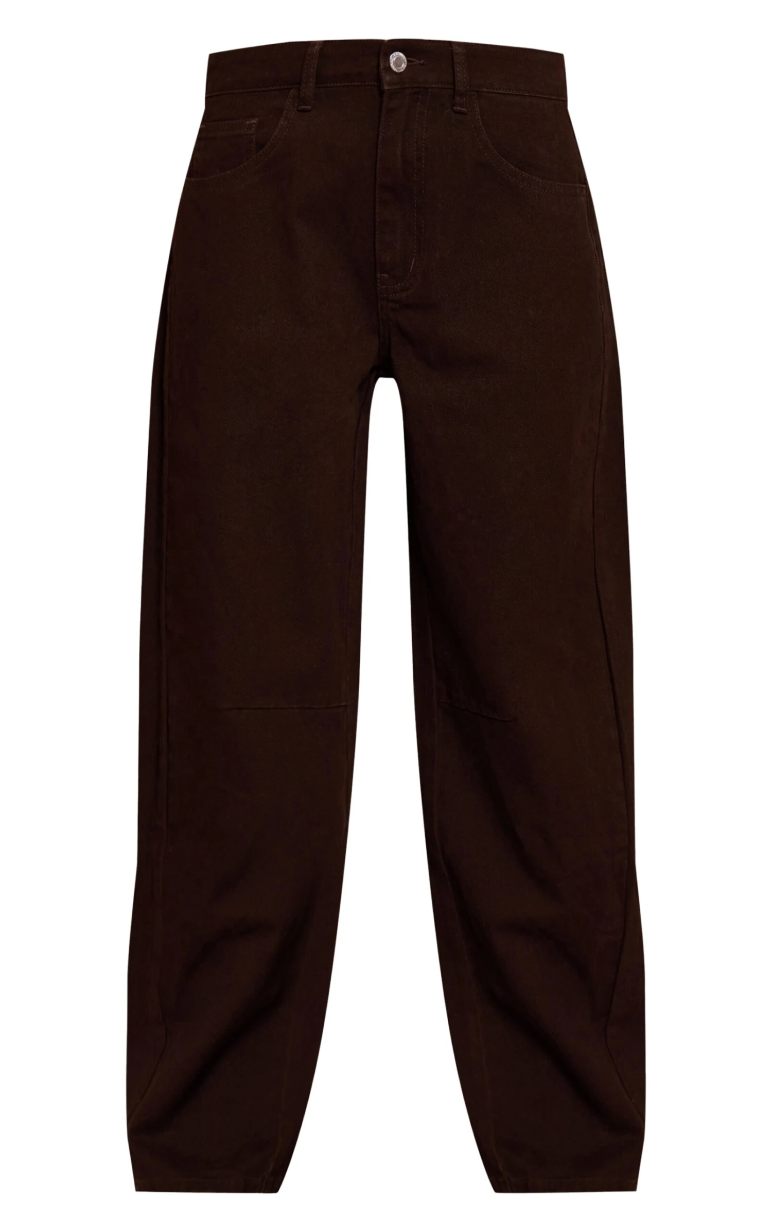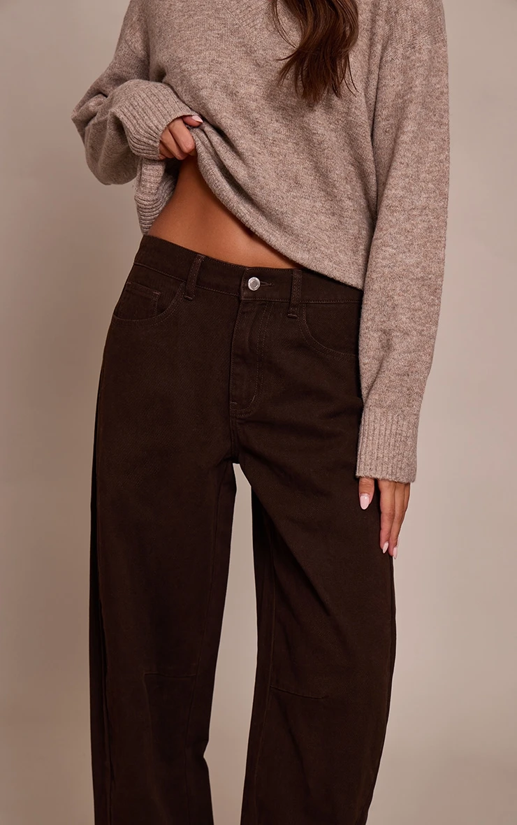 The sartorial update your denim rotation demands is here with these chocolate seam detail low rise barrel jeans, offering a distinctive cut that merges a contemporary low-rise waist with an effortlessly wide barrel leg. Rendered in a rich chocolate hue, the artful seam detailing across the knee adds an unexpected edge to this modern silhouette. Team these versatile jeans with a sleek fitted long-sleeve top or a chunky knit sweater for an elevated day aesthetic. Anchor your look with knee high boots for an assured, fashion-forward statement, completed by a pair of striking statement earrings to truly command attention.