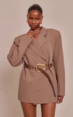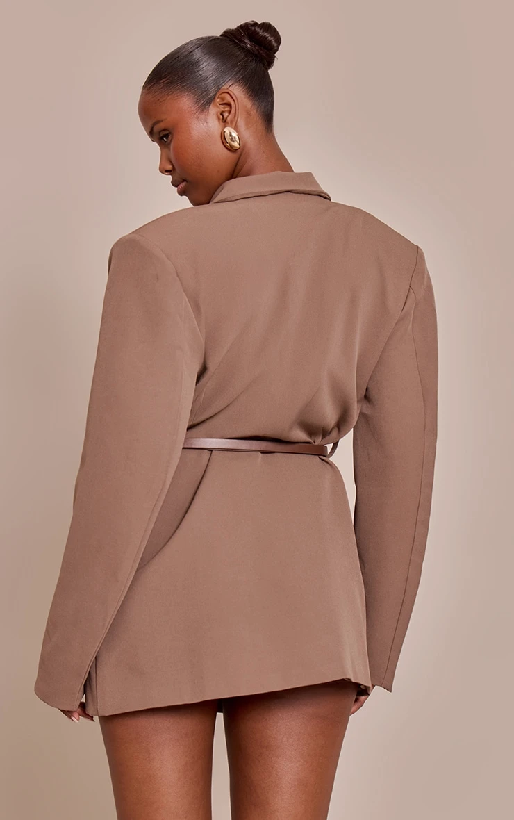 Opt for tailored chic in the chocolate woven belt blazer dress. Made from a chocolate woven material, it features a belted waist, blazer silhouette, and mini length for a structured look. Style with gold accessories and a pair of kitten heels for a polished outfit.