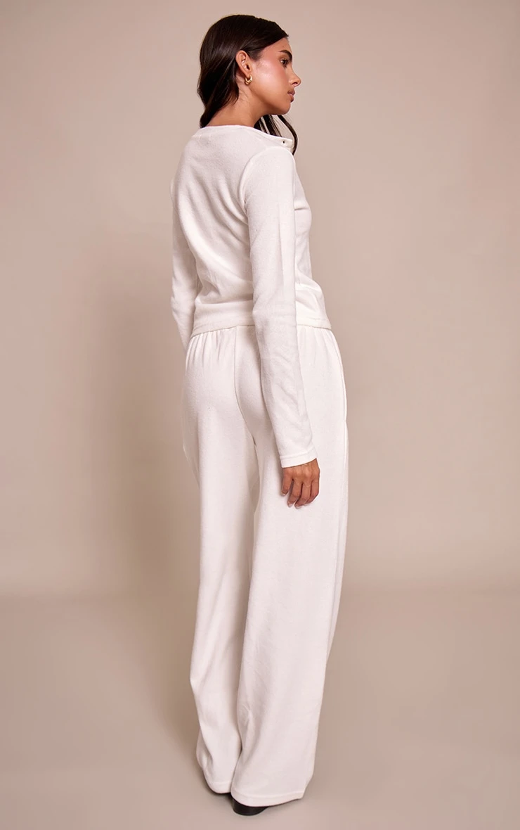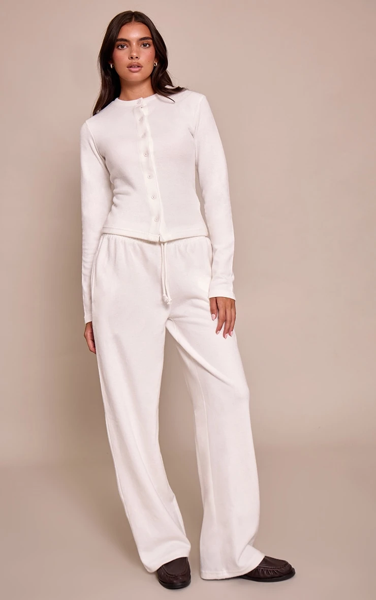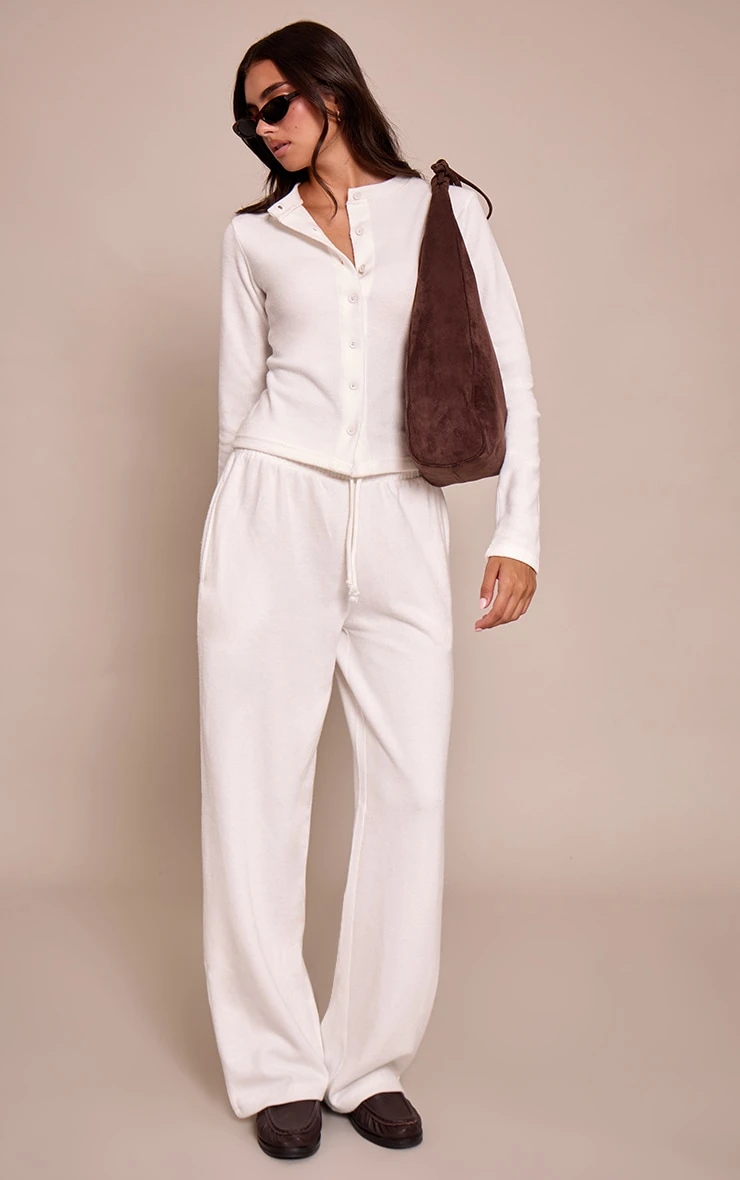 Own your relaxed aesthetic with undeniable ease. The cream soft touch wide leg sweatpant anchors your look with its generous cut and flowing line, while an adjustable drawstring waist ensures a refined, custom fit for effortless all-day wear. Team these essential sweatpants with a sleek, coordinating sweater for a cohesive statement, or introduce an oversized shirt for a confident contrast. Ground your ensemble with on-trend chunky boots for an elevated edge, then complete your aesthetic with a structured black bag, commanding your day with an understated, knowing presence.