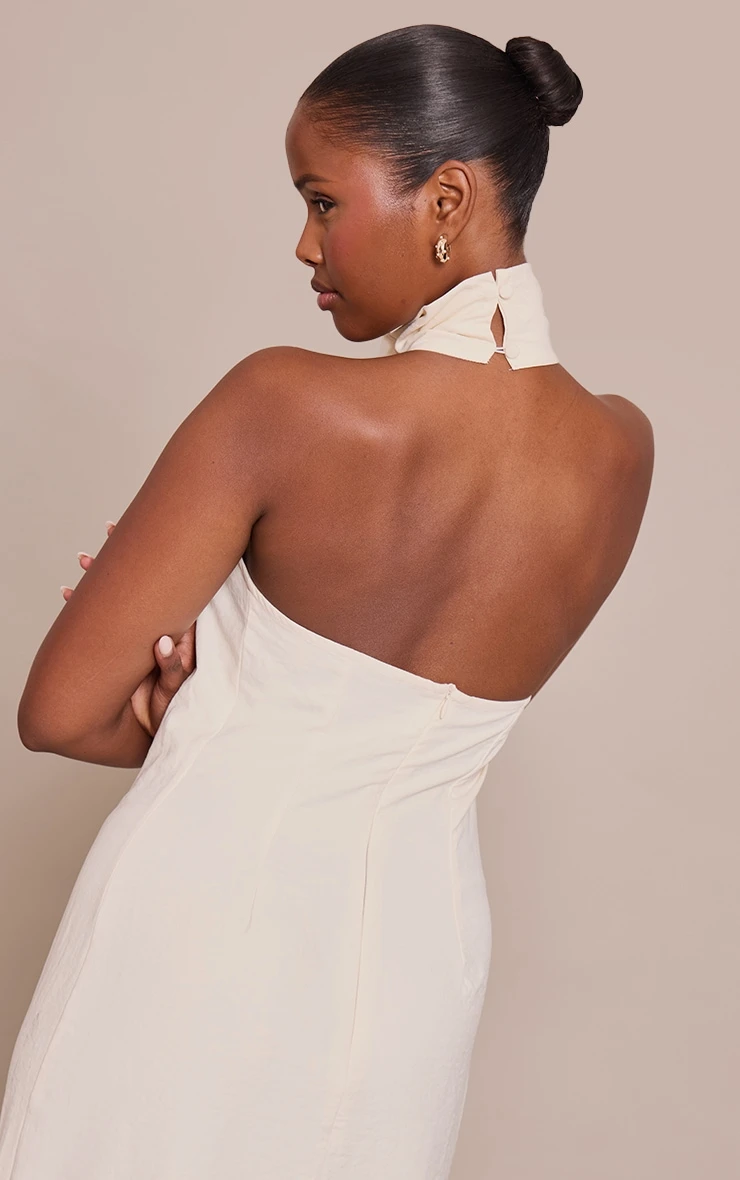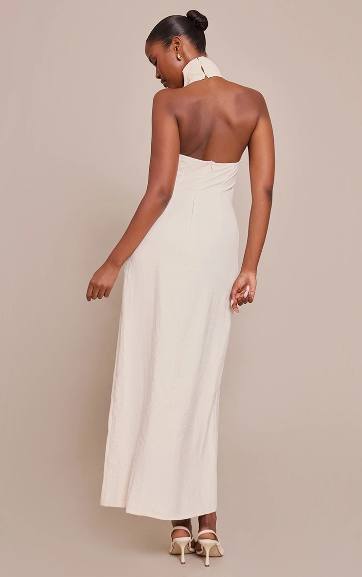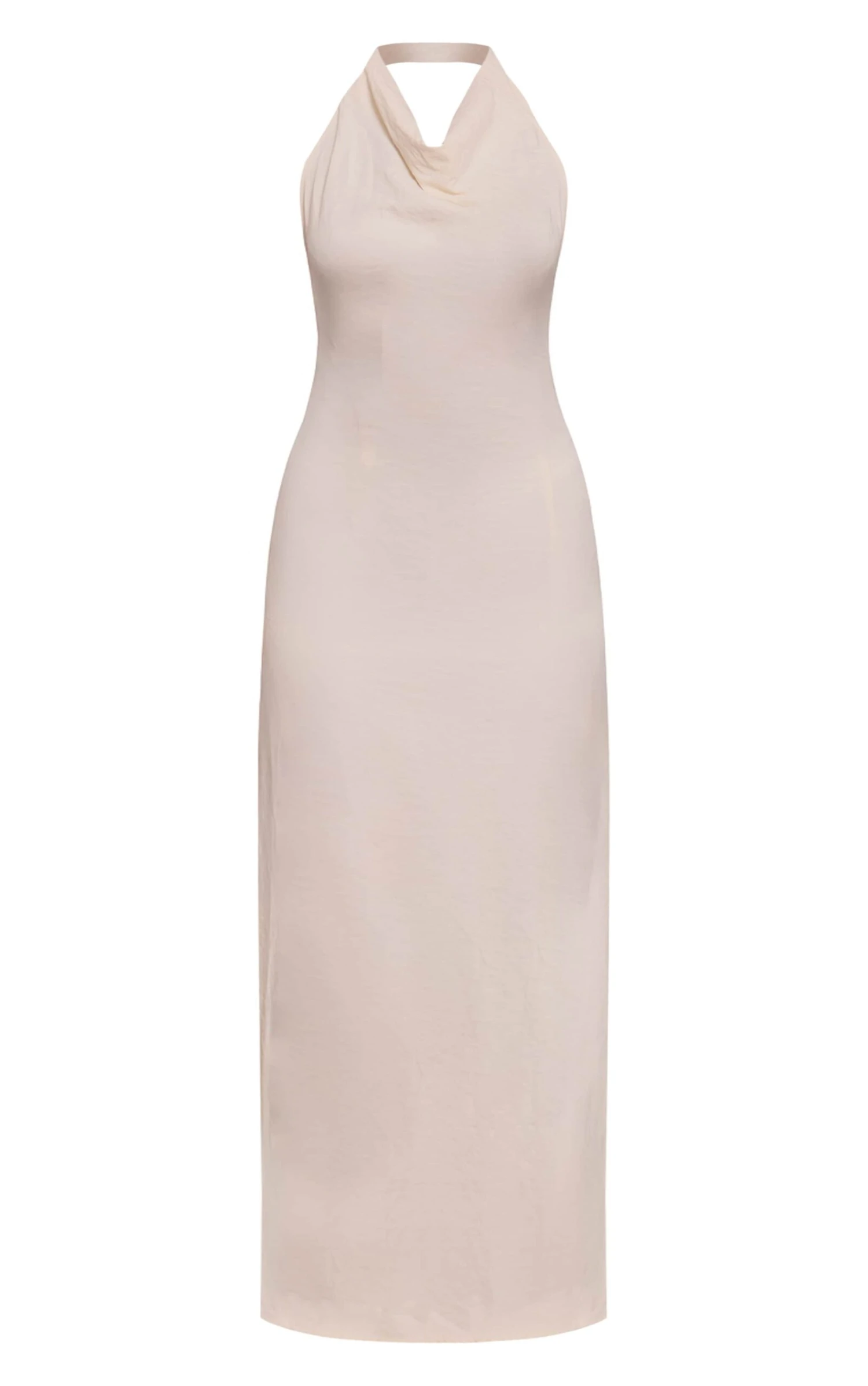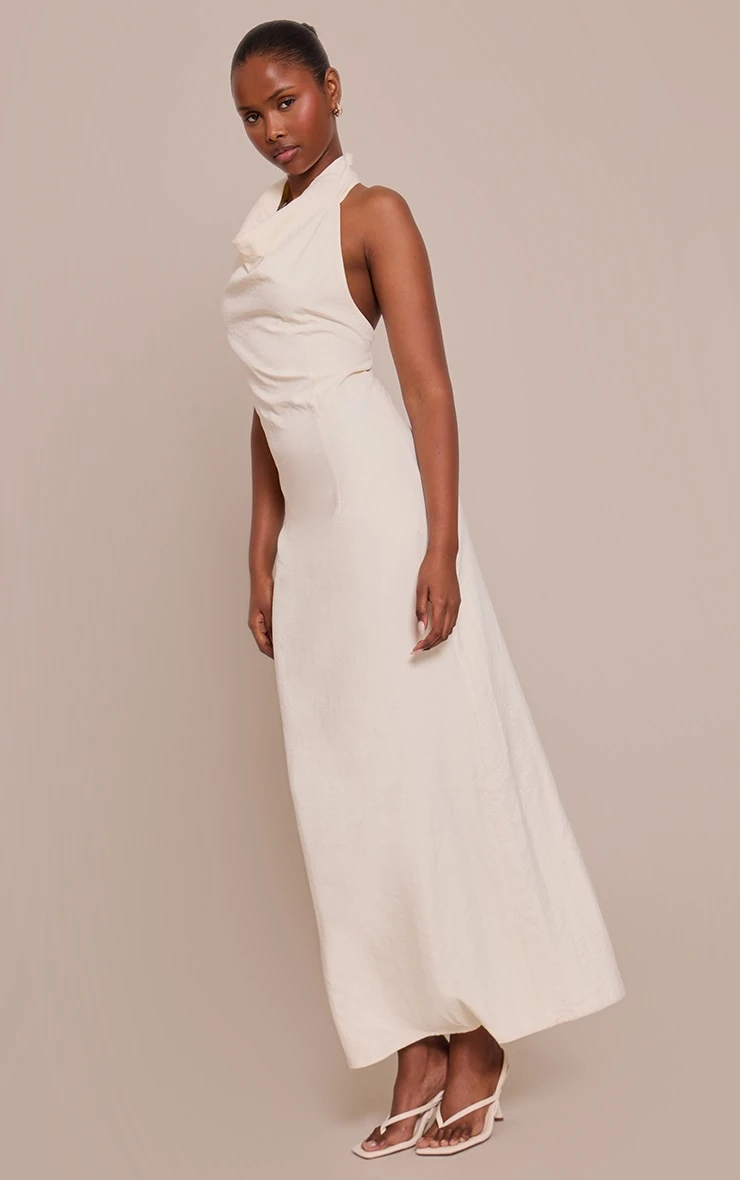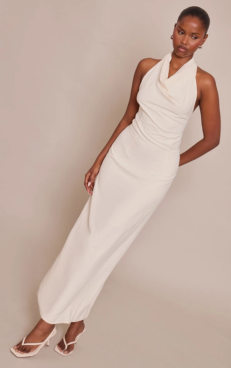 Effortless confidence defines your daywear. The cream textured cowl neck sleeveless maxi dress offers a refined silhouette with its distinct draped neckline and understated maxi length. This shift style, in a versatile cream hue, provides a clean canvas for considered styling. Ground this piece with contemporary heeled mules, and complete your look with subtle stud earrings for an impactful, minimal finish. It’s the essential foundation for a knowing, artful ensemble.