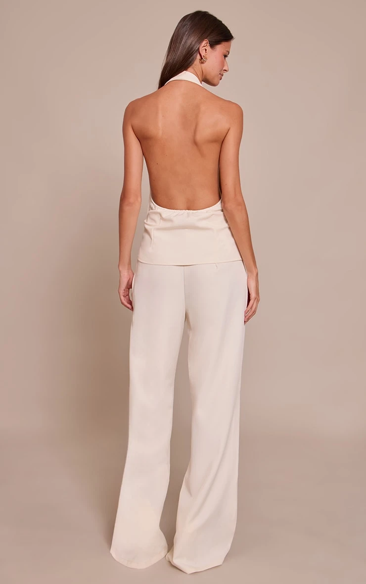 Navigate any event with an innate sense of style, courtesy of a design that redefines modern dressing. The cream waist coat straight leg jumpsuit brings a confident edge to occasion dressing with its distinctive vest upper, featuring a refined V-neckline and polished value fastening down the front, seamlessly merging with a sleek halter-neck design. This striking silhouette flows effortlessly into a sophisticated straight-leg pant, creating an elongated and balanced line perfect for evening wear. For an effortlessly put-together look, complete this cream ensemble with elegant black kitten heels and a pair of delicate drop earrings, ensuring you own the room with understated confidence.