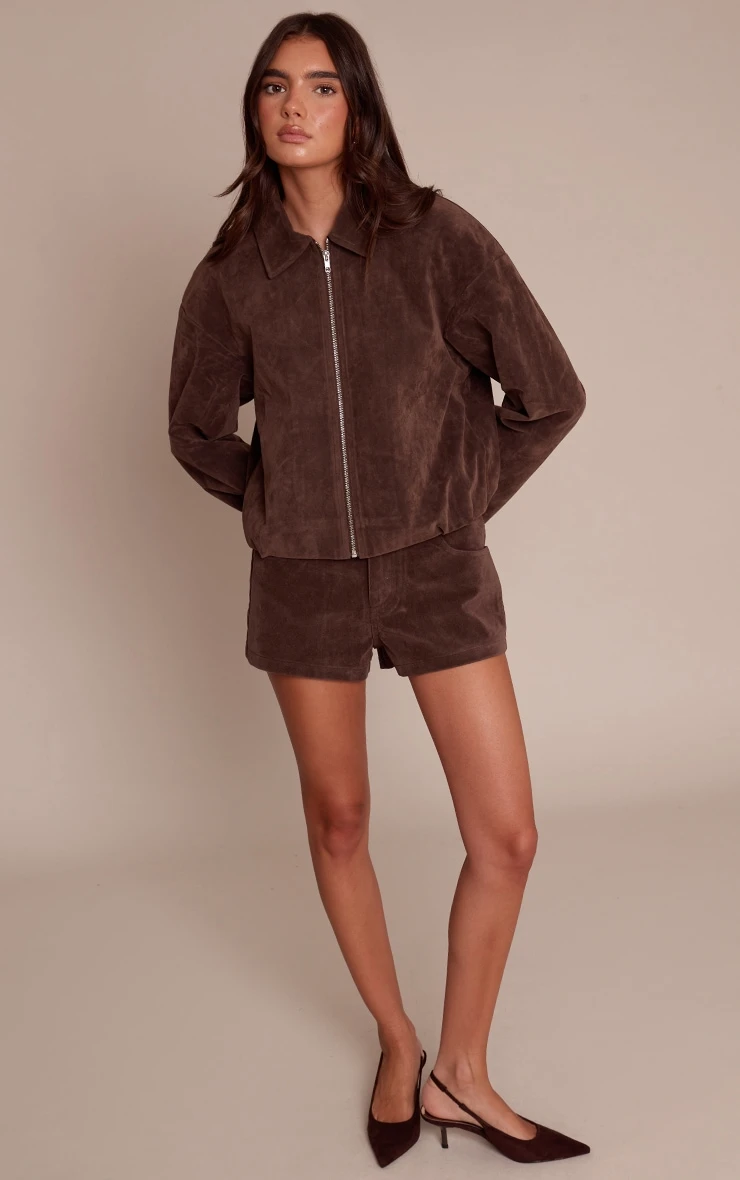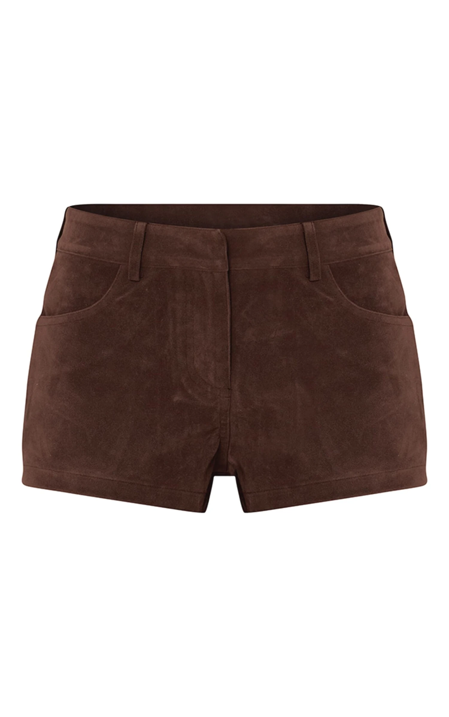 Inject a refined edge into your seasonal wardrobe. The dark brown suede tailored shorts offer a modern interpretation of smart casual; cut to a flattering short length, their crisp lines and thoughtful tailoring speak to an elevated aesthetic, making them an essential for curated daywear. Style these with an oversized shirt or a structured knit top for an assured ensemble, completing the look with pointed toe heels for an intentional, confident stride. Alternatively, add subtle pearl earrings to enhance the sophisticated appeal of your day outfit. A versatile piece designed for impact.
