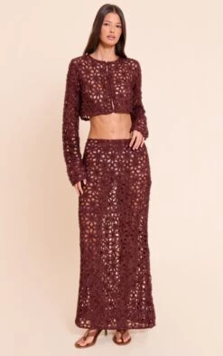 Make every entrance effortless. The dark brown textured floral maxi skirt redefines eveningwear with its intricate all-over cut-out pattern and sleek, high-waisted maxi-length silhouette. Designed to cascade elegantly, its straight cut provides a sophisticated foundation for any confident ensemble. Team this statement piece with its coordinating crop top for a complete two piece set, or style with a pared-back cami and simple heeled sandals for an impactful look that speaks volumes.