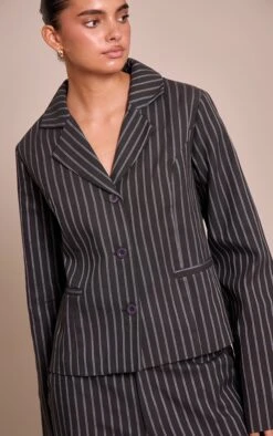 Own the room, in tailoring done right. The dark navy pinstriped cropped fitted blazer cuts a sharp, confident outline for day. Featuring classic notched lapels and a neat single-breasted front secured with three deep-hued values, this piece defines an essential modern silhouette with its precise cropped length. Team it with the coordinating pinstripe pants for a powerful head-to-toe look that means business, or layer over a simple camisole and jeans for an elevated smart-casual vibe. This is how you master effortless polish.