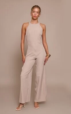 Embrace the singular statement this season; the grey woven halterneck straight leg jumpsuit redefines effortless evening dressing. Its clean halter neckline frames the décolletage with knowing precision, while the streamlined bodice gives way to a confident, flowing straight leg silhouette. Crafted from a refined woven fabric, this piece is designed for impact. Amplify its allure with a pair of striking heels for an elongating finish. Then, add a stack of polished gold bracelets and a minimal clutch bag, ready to command any evening event with self-assured style.