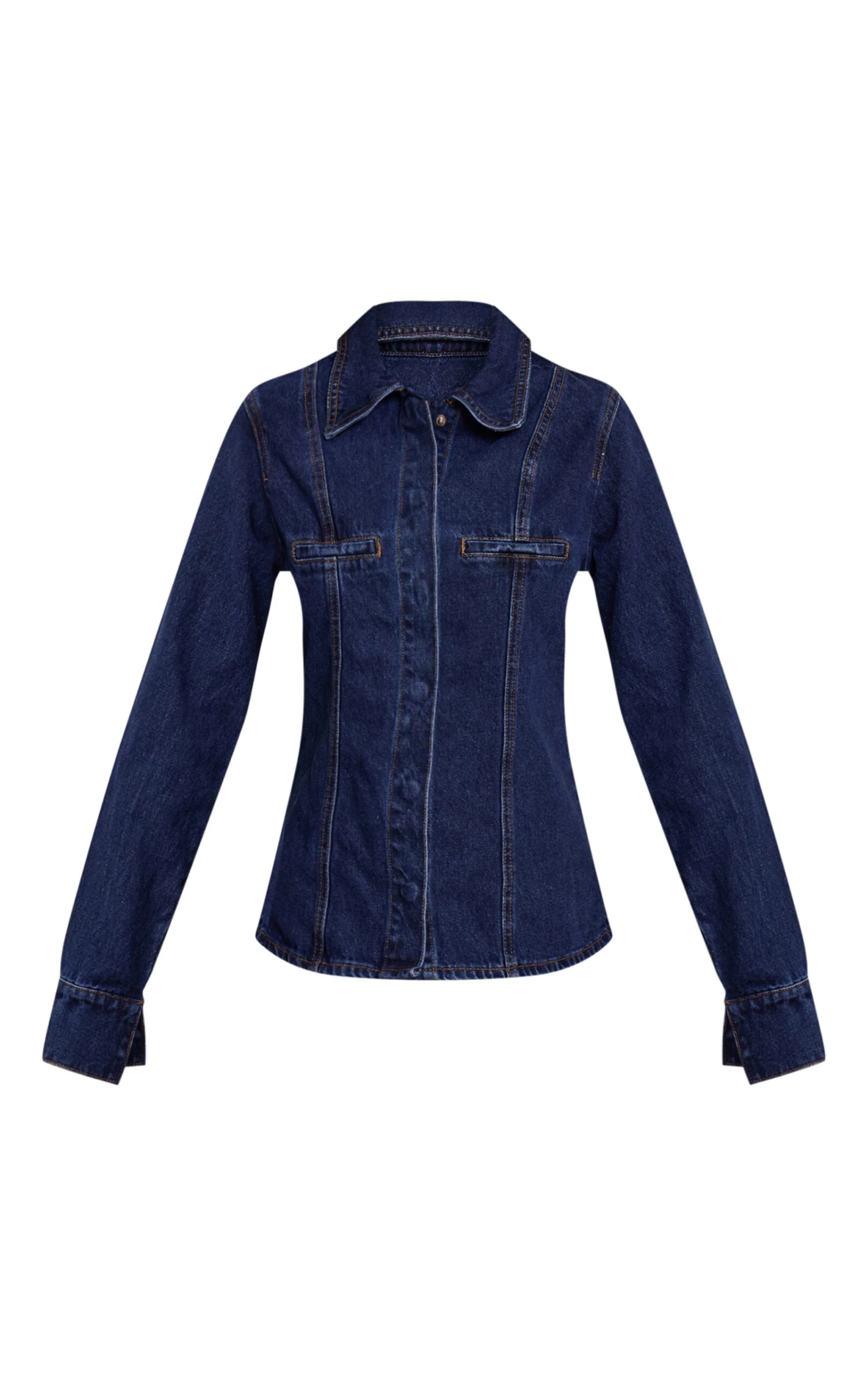 Structure meets sartorial precision in this essential denim piece, the indigo fitted seam detail shirt. This knowing design in a rich indigo hue features a classic collar and full value front, meticulously shaped with prominent vertical seams that sculpt an artful silhouette, complemented by subtle flap pockets at the chest. Achieve a cohesive aesthetic by pairing it with matching indigo denim jeans, then ground the look with sleek mid calf boots and a stack of beaded bracelets for an effortless, confident finish that speaks volumes.