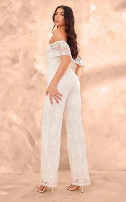 Prettylittlething Butter Cream Shimmer Floral Lace Bardot Jumpsuit