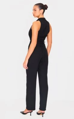 Prettylittlething Black Tailored Woven Vest Lace Up Detail Jumpsuit
