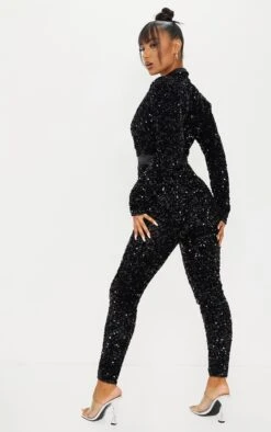 Prettylittlething Black Velvet Sequin Plunge Front Tailored Jumpsuit