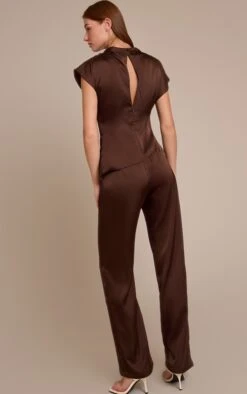 Prettylittlething Chocolate Satin Cap Sleeve Straight Leg Jumpsuit