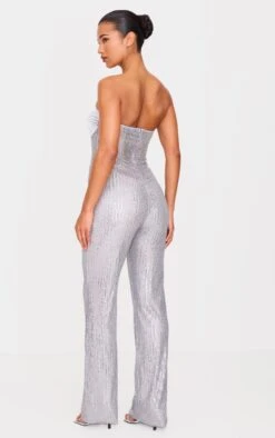 Prettylittlething Silver Glitter Plisse Flare Sleeve Plunge Romper