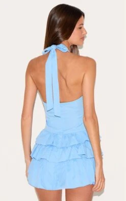 Prettylittlething Sky Blue Cotton Ruched Tiered Skort Shirt Romper