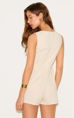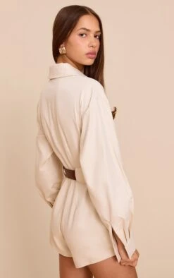 Prettylittlething Taupe Tailored Woven Cinched Waist Long Sleeve Romper