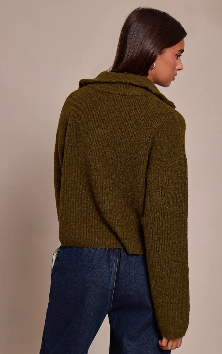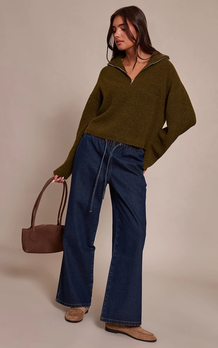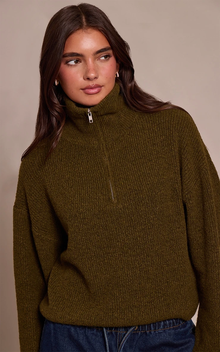 Your off-duty rotation just got an upgrade. The khaki half zip soft knit sweater is your answer to relaxed sophistication, featuring a distinctive half-zip fastening that leads to a sharp, stand-up collar and a comfortable drop-shoulder design. Its effortlessly oversized cut ensures a confident drape, perfect for styling with high-waisted tailored pants and chunky boots for an elevated day look. Finish the ensemble with minimalist gold jewelry to cement your status as truly fashion-forward.