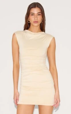 Made from almond hue material with a chic boat neck, waist ruched detailing and a sleek bodycon fit. Elevate your look with this almond double contour boat neck ruched bodycon dress, perfect for teaming with closed toe stiletto heels and muted gold earrings.