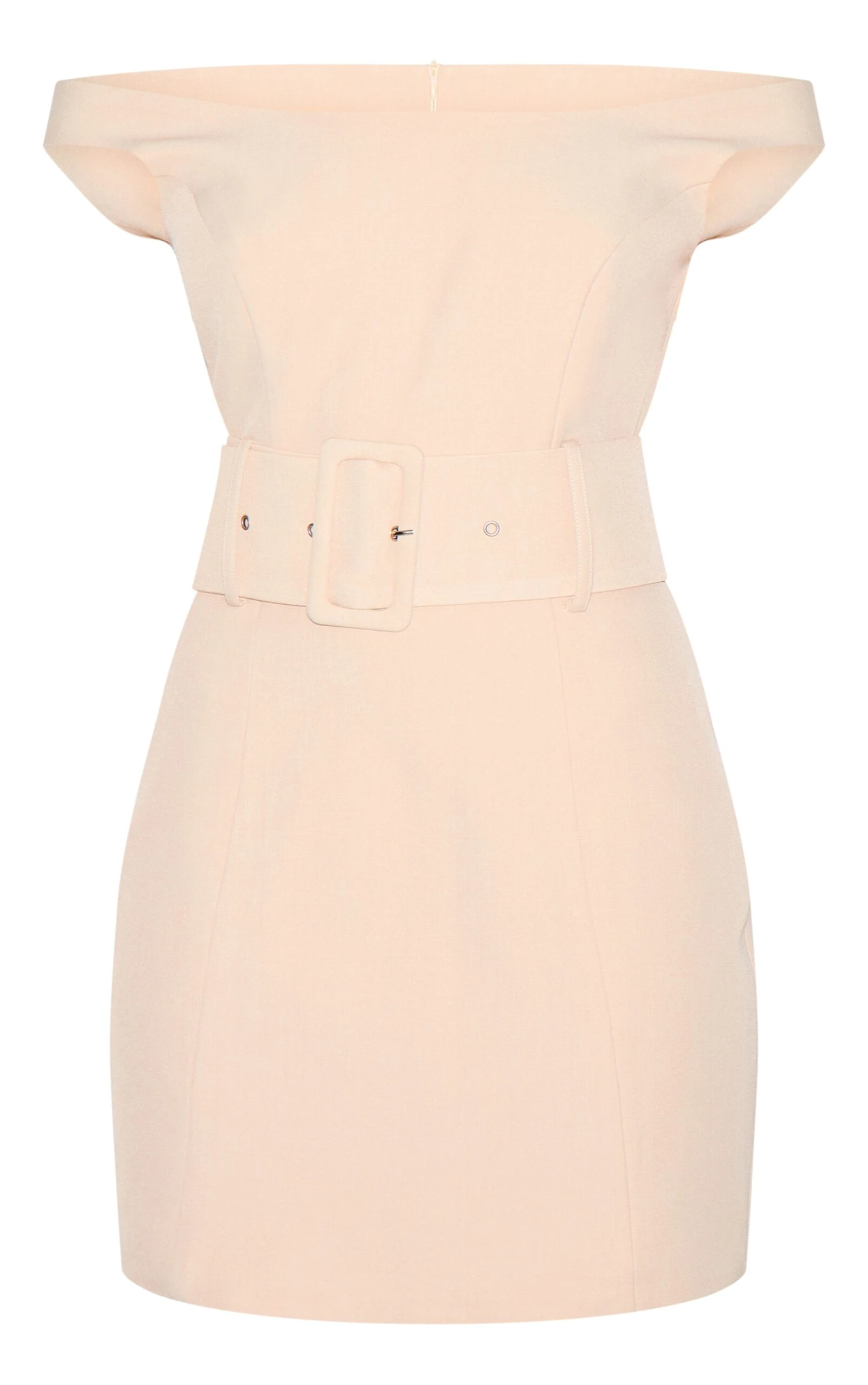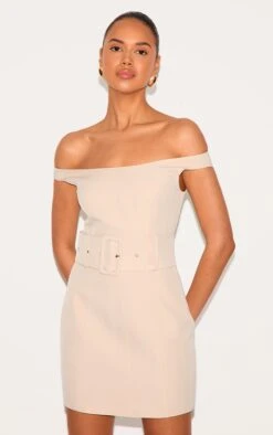 Elevate your after-dark repertoire with this masterclass in minimalist chic. Crafted from a woven almond fabric, this off-shoulder mini dress offers a subtly structured silhouette, cinched with a considered belt detail to define the waist. The neckline frames the décolletage with understated elegance. Let this piece command attention with sculptural gold earrings, selected from our jewelry collection, for an impeccable evening statement.