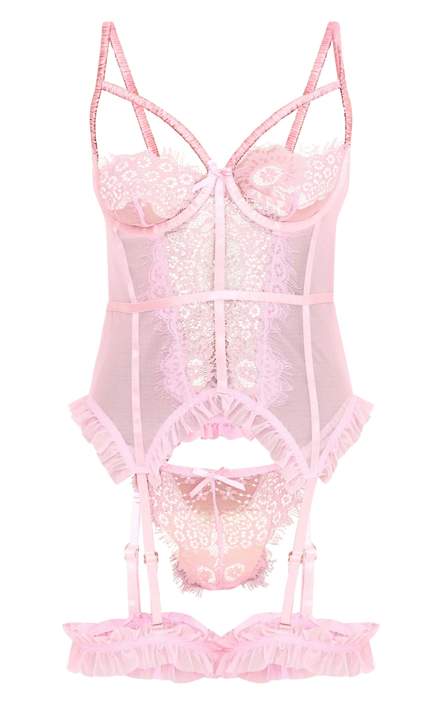 Ethereal eyelash lace in baby pink elevates this longline corset lingerie set, a study in considered design. The delicate frill detailing adds a touch of romanticism to the structured corset and accompanying thong. Note the integrated suspender straps – a nod to vintage silhouettes, reimagined for the modern wardrobe. Style this set beneath a tailored blazer, leaving a hint of lace visible, and complete the look with our barely-there hosiery.