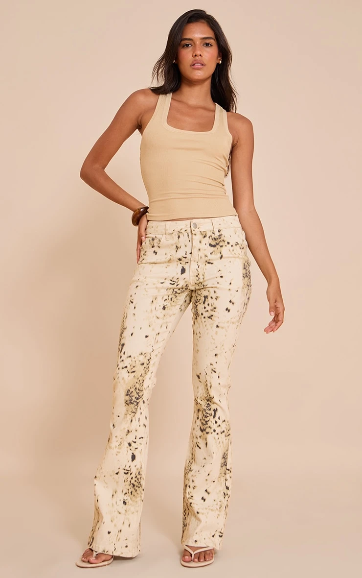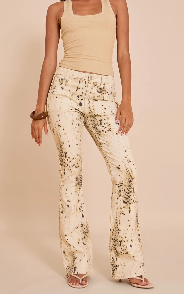 Stand out from the rest this season in these beige snow leopard flared jeans. Brought to you in a beige hue material with a snow leopard design, you won’t blend in this season. With a flared detailing these jeans give you a flattering fit like no other. Team with a tank top and a pair of slip on heels for finished look we are loving.
