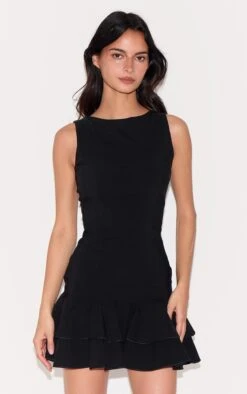 The LBD, reimagined. This black shift dress offers a masterclass in understated structure, defined by a clean boat neckline and a subtly pleated hem that adds movement to the minimalist silhouette. Crafted in a durable, easy-care fabric, it’s a piece designed for longevity and versatile styling. Elevate the look with sculptural earrings from our jewelry collection for an evening-ready statement.