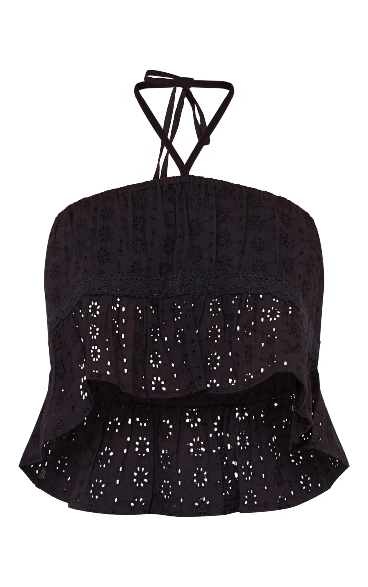 Upgrade your seasonal wardrobe with this black broderie crochet trim halter crop top. Brought to you in a black broderie material with a crochet trim design and halter neck fastening, we’re in love. Style this crop top with the matching shorts, sandals and accessories for a combo we’re crushing on this season.