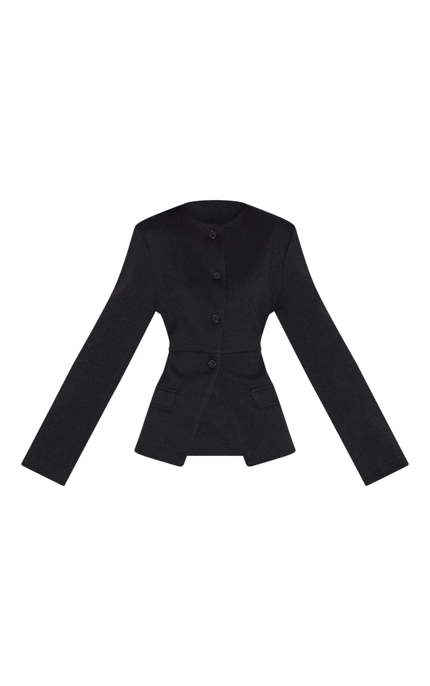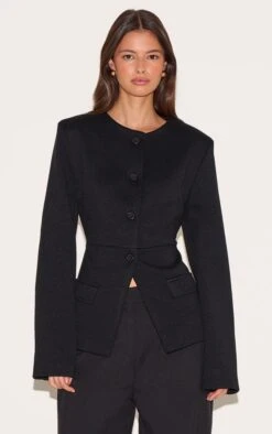 Crafted from a black material with a value up fastening, a longline fit and a collarless detailing. Team this black value up longline collarless blazer with some wide leg pants and a pair of heels for an elevated finish.