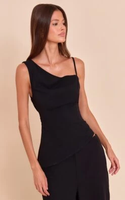 Step up your evening look with the Black Chiffon Asymmetric Cami Top. Crafted in lightweight chiffon, this top brings elegance with a modern twist. The asymmetric neckline creates a statement silhouette, while the delicate cami straps keep it chic and feminine. Perfect for pairing with tailored pants, faux leather skirts, or wide-leg jeans, this versatile piece takes you seamlessly from dinner to drinks. Its floaty yet flattering fit makes it a timeless wardrobe staple that you’ll reach for season after season.