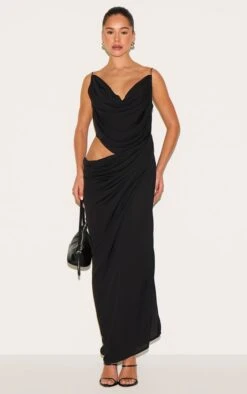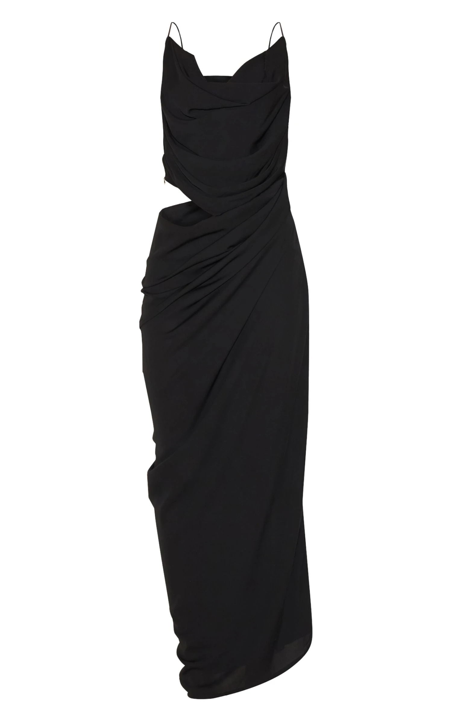 Crafted from a black chiffon material with a cut out detailing, a drape design and an effortlessly chic maxi length.