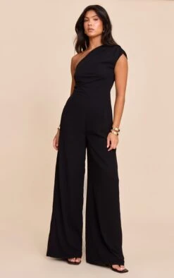 Unveil confident evening style with the black chiffon one shoulder ruched jumpsuit. Its artful one-shoulder neckline creates a striking upper profile, while delicate ruching details sculpt the bodice, leading to a cinched waist. Flowing wide-leg pants elongate the frame, presenting a modern, clean line perfect for any after-dark occasion. Amplify its sophisticated ease with sleek black heeled sandals and bold gold cuffs, ensuring a sharp, knowing finish for any evening event.