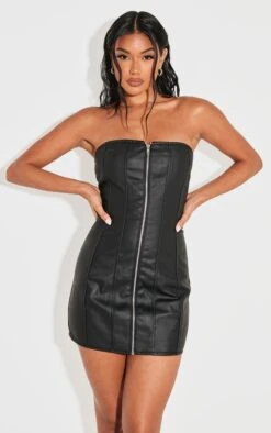 Consider this your new-season style blueprint. This black coated denim bandeau dress offers an architectural edge with its exposed seam detailing and confident zip-up front. The coated denim provides a modern, almost sculptural silhouette, ideal for making a considered entrance. Elevate the look further with a delicate chainmail bag for a touch of refined rebellion.