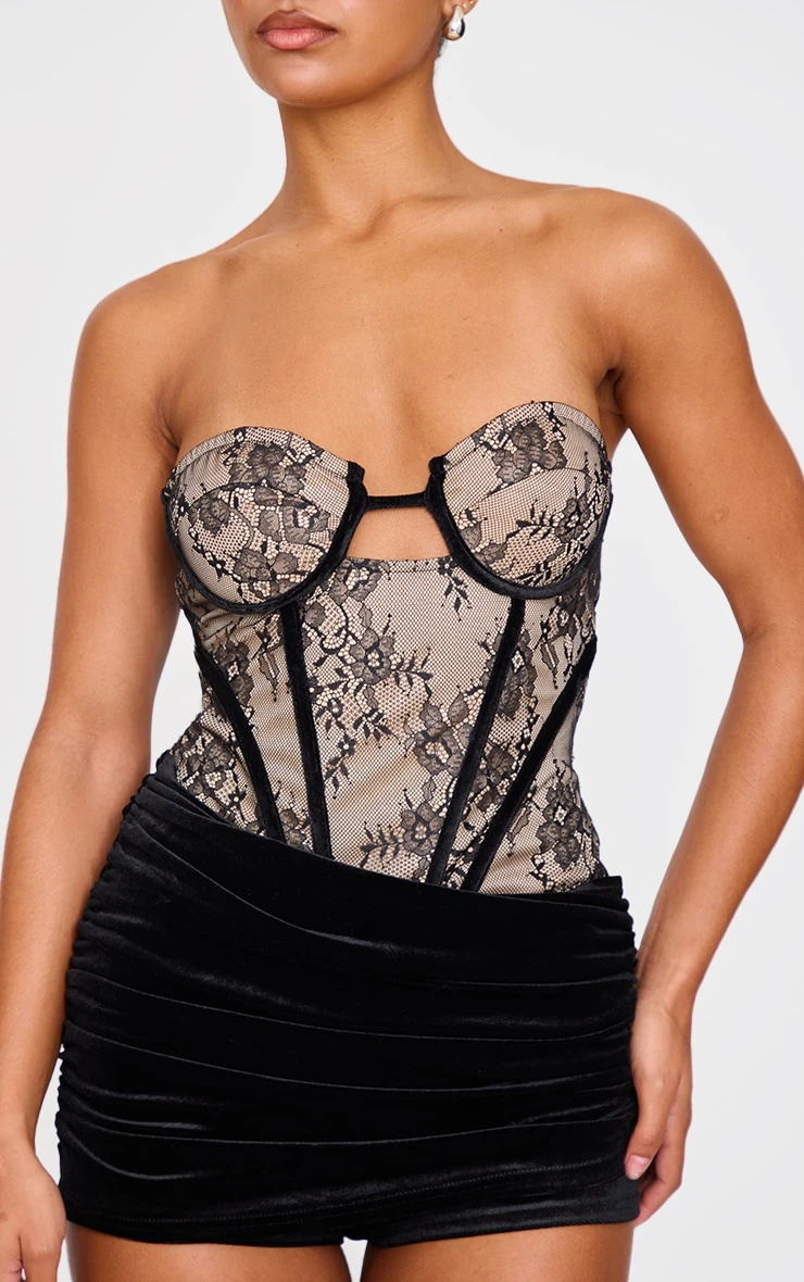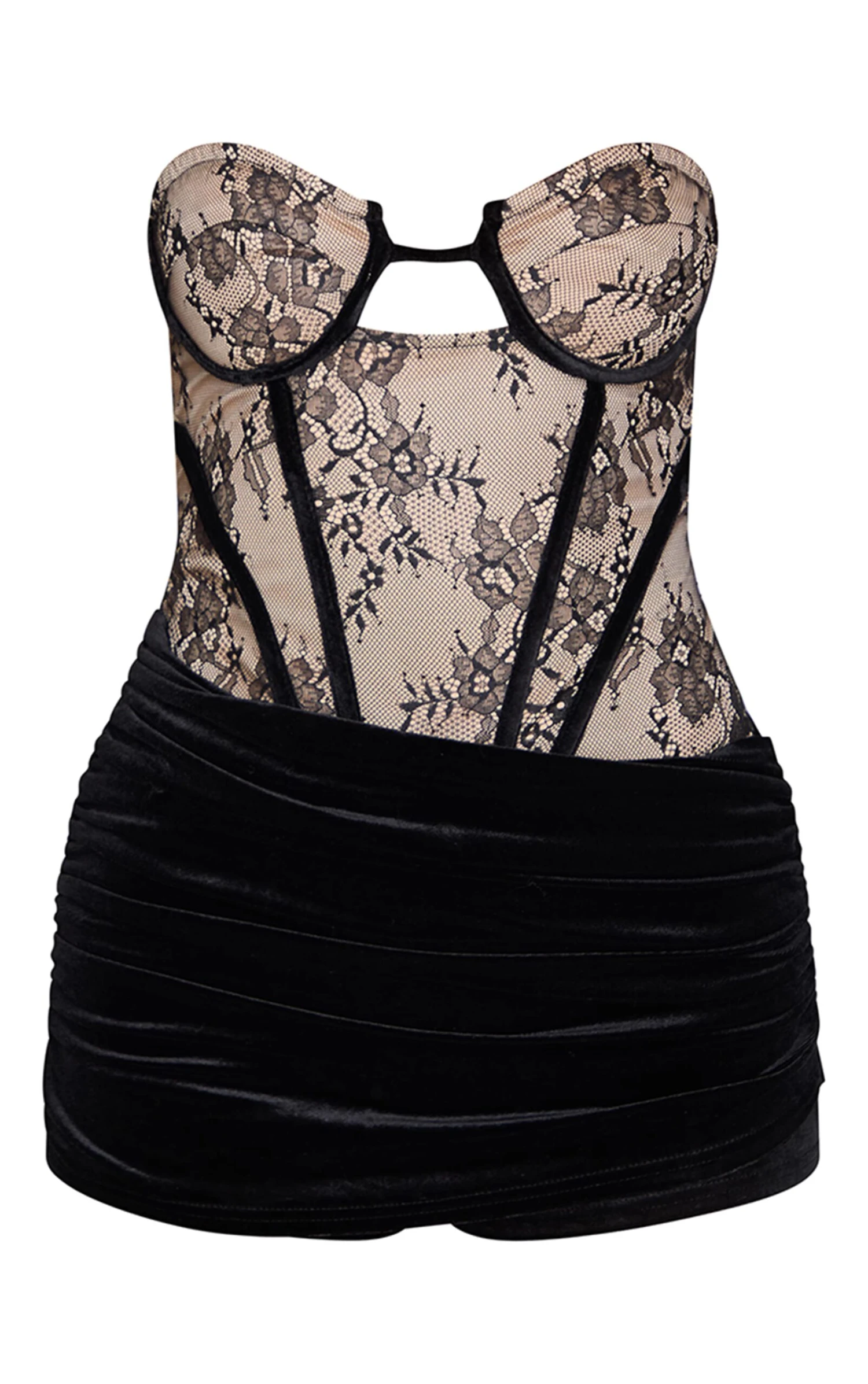 The velvet romper, reimagined. This piece artfully blends textures and silhouettes, offering a contemporary take on evening elegance. Observe the refined contrast lace detailing that elevates the plush black velvet. The wrap-style skort bottom introduces a directional edge, perfect for navigating city nights. Style yours with a delicate chain necklace from our jewelry collection to further refine the look.