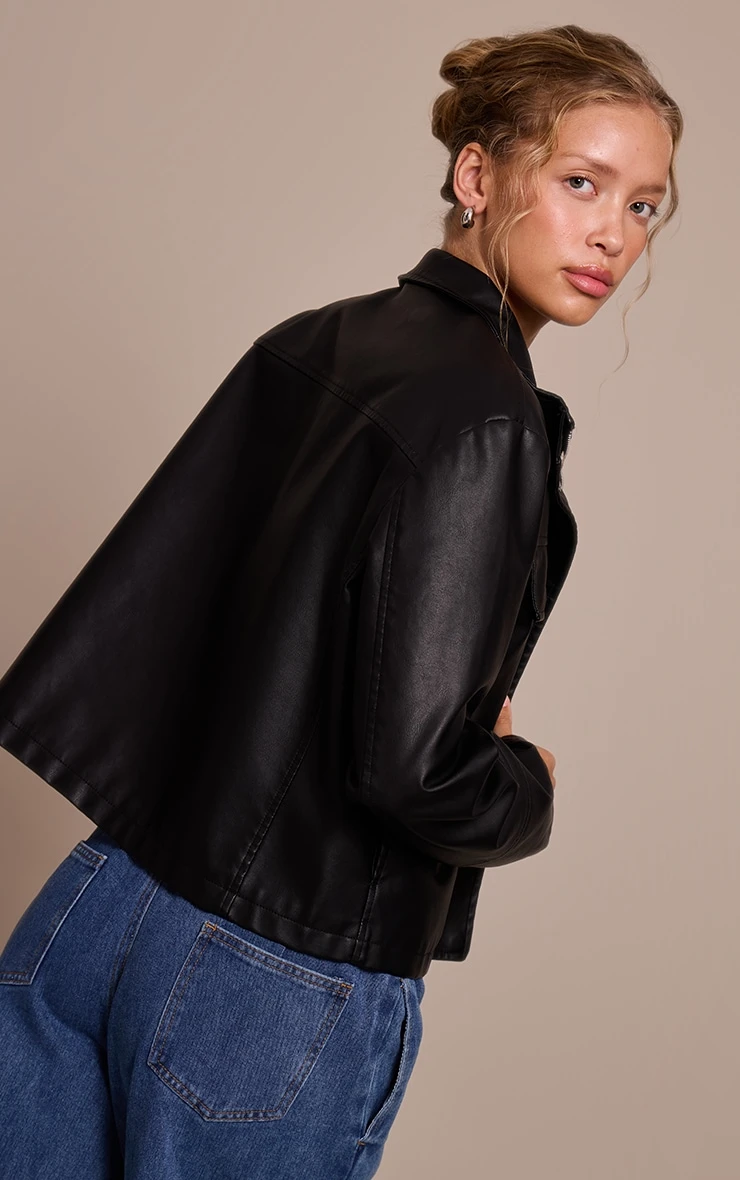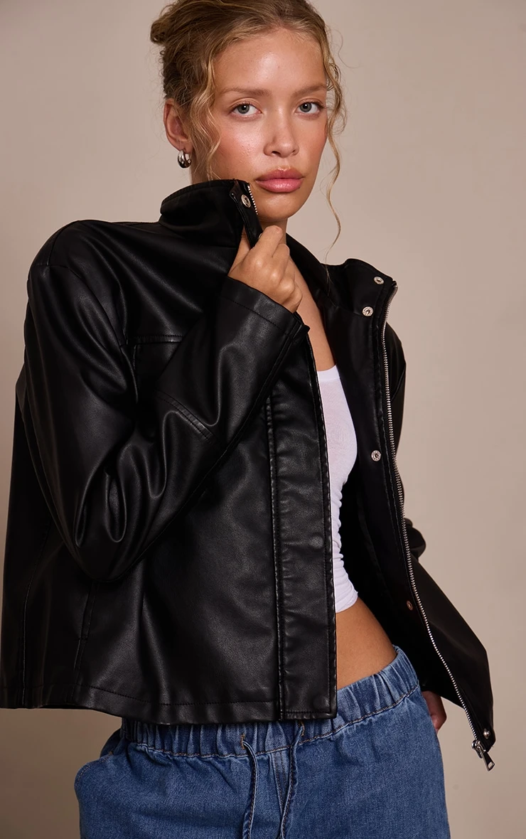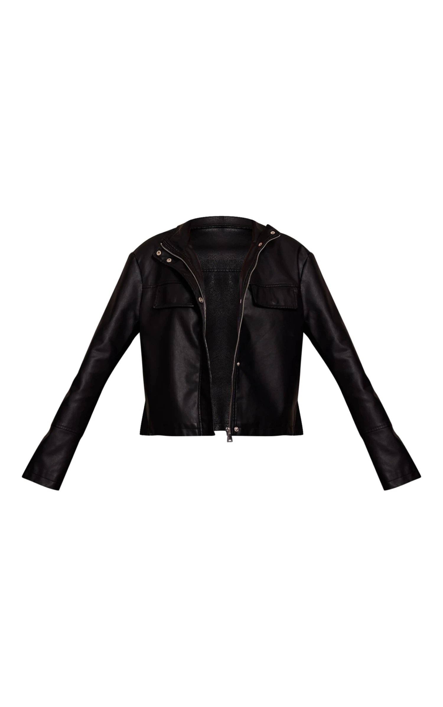 Add edge to your look in this black faux leather funnel neck jacket. Made from black faux leather, this jacket has a funnel neckline, zip fastening and long sleeves. Add it to a basic white tee, blue wide leg jeans and your go-to ballet flats for the perfect seasonal look.