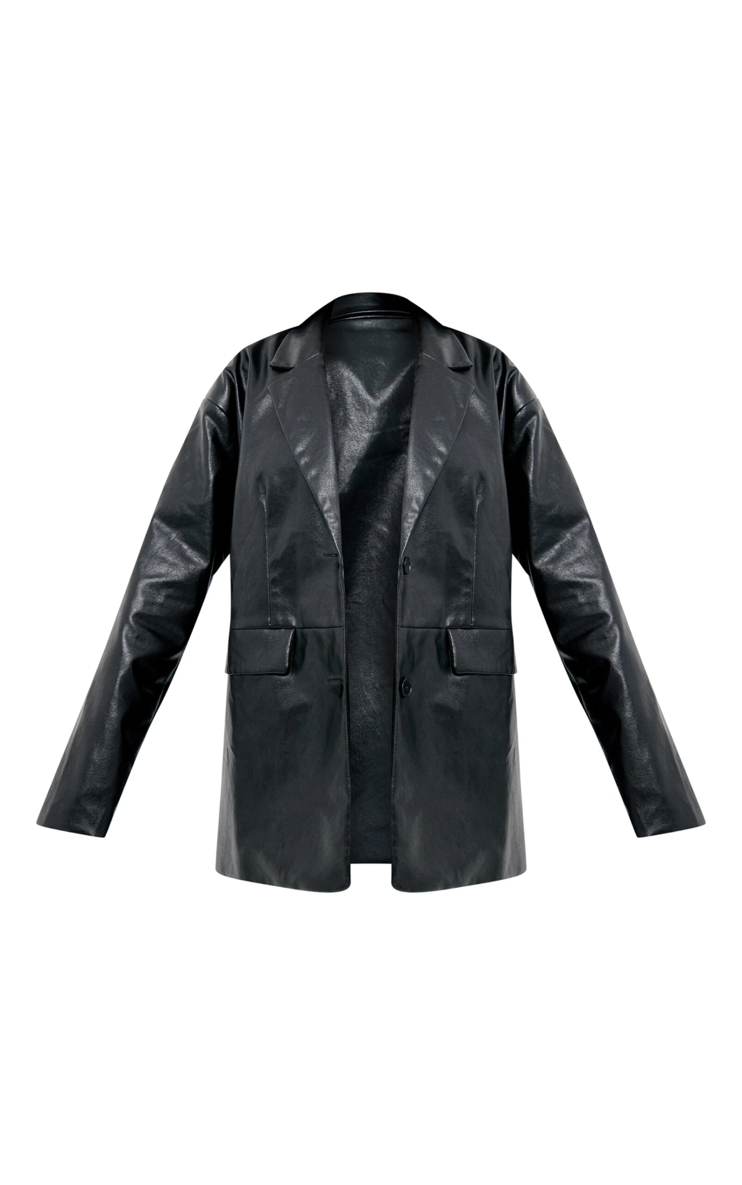The cornerstone of any curated wardrobe, this black faux leather blazer offers a modern take on tailoring. Crafted in a smooth faux leather, the oversized silhouette lends itself to endless styling possibilities. The longline cut adds a considered edge to both casual and evening ensembles. Layer it over a fitted top and team with a pair of tailored pants from our bottoms collection for a confident, contemporary look.
