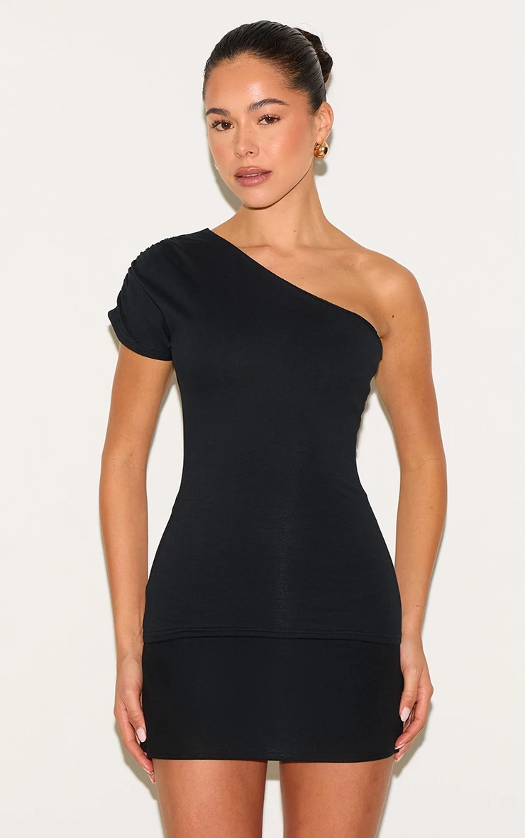 Crafted from black material with asymmetric one shoulder detailing and a flattering hip length fit. For an effortlessly chic outfit, pair this black one shoulder asymmetric top with a black mini skirt, statement jewelry, a black bag and your favorite heels.