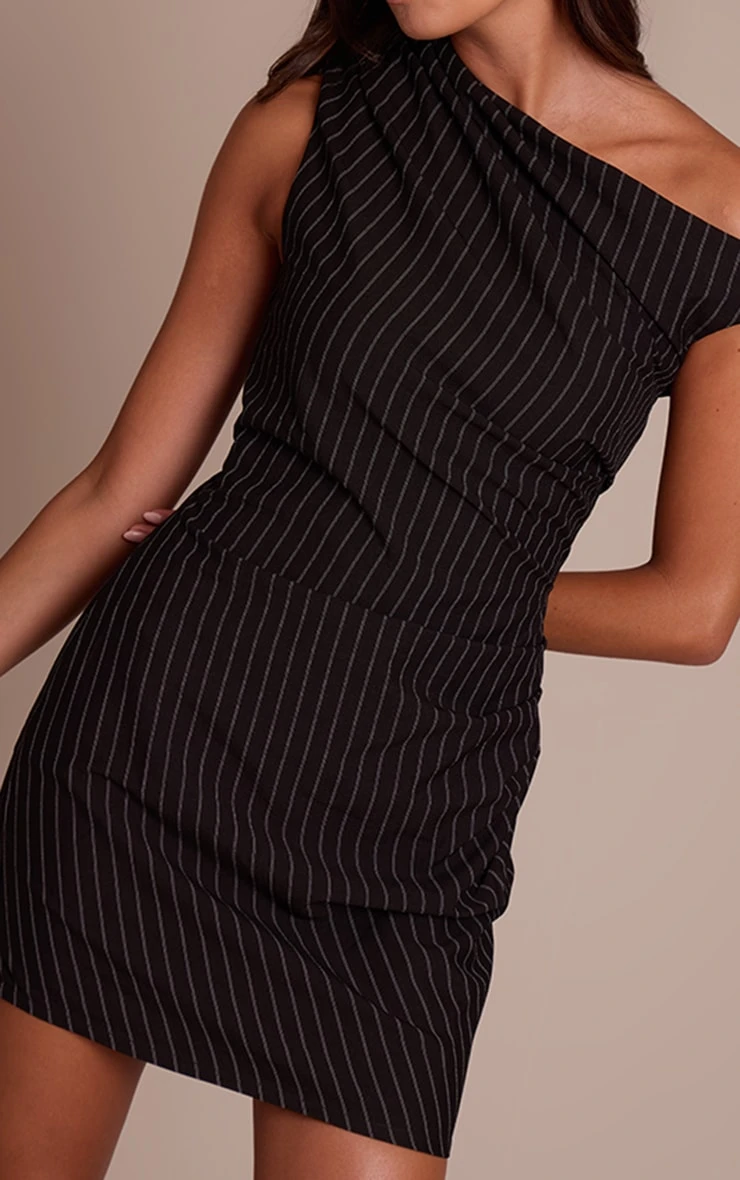 The black pinstripe asymmetric bodycon dress delivers tailored polish with a modern twist. Cut in a sleek pinstripe fabric, this dress hugs the figure in a classic bodycon fit, while the asymmetric neckline brings a fashion-forward edge. A perfect mix of business-inspired tailoring and night-out styling. Wear with court heels and a sleek bun for office-to-bar chic, or add a leather jacket for an urban-inspired evening look.