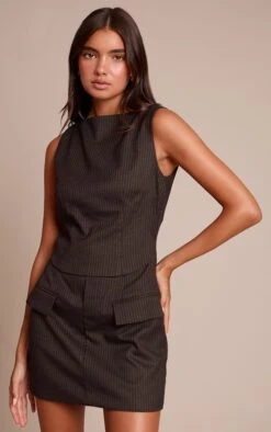 Navigate your day with undeniable style, thanks to the black pinstripe overlay detail bodycon dress. This artfully tailored piece features a sleek high neckline and sleeveless cut, its striking pinstripe pattern defining a confident silhouette. The unique overlay detail, complete with subtle flap pockets at the hip, creates an effortlessly sharp profile. Elevate this look further with sophisticated stiletto heels and delicate gold earrings for a polished ensemble that owns the moment.