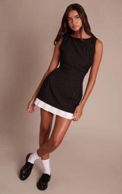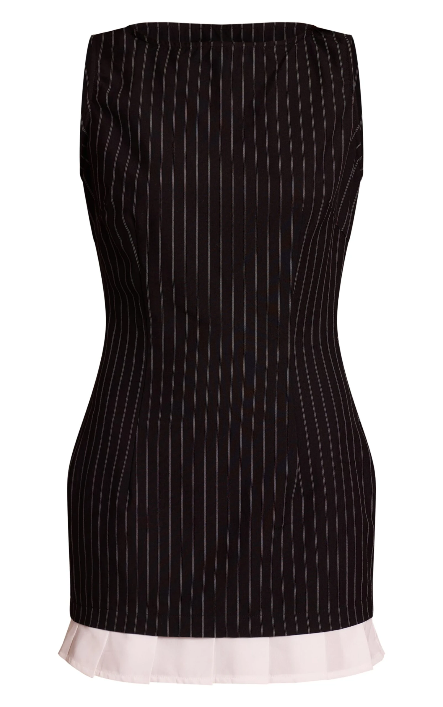 Stay bold in the black pinstripe pleated hem detail bodycon dress. Made from a black pinstripe material, it features pleated hem detailing, a bodycon silhouette, and a mini length. Style with slip on mule heels or loafers and a clutch bag for an effortlessly polished look.