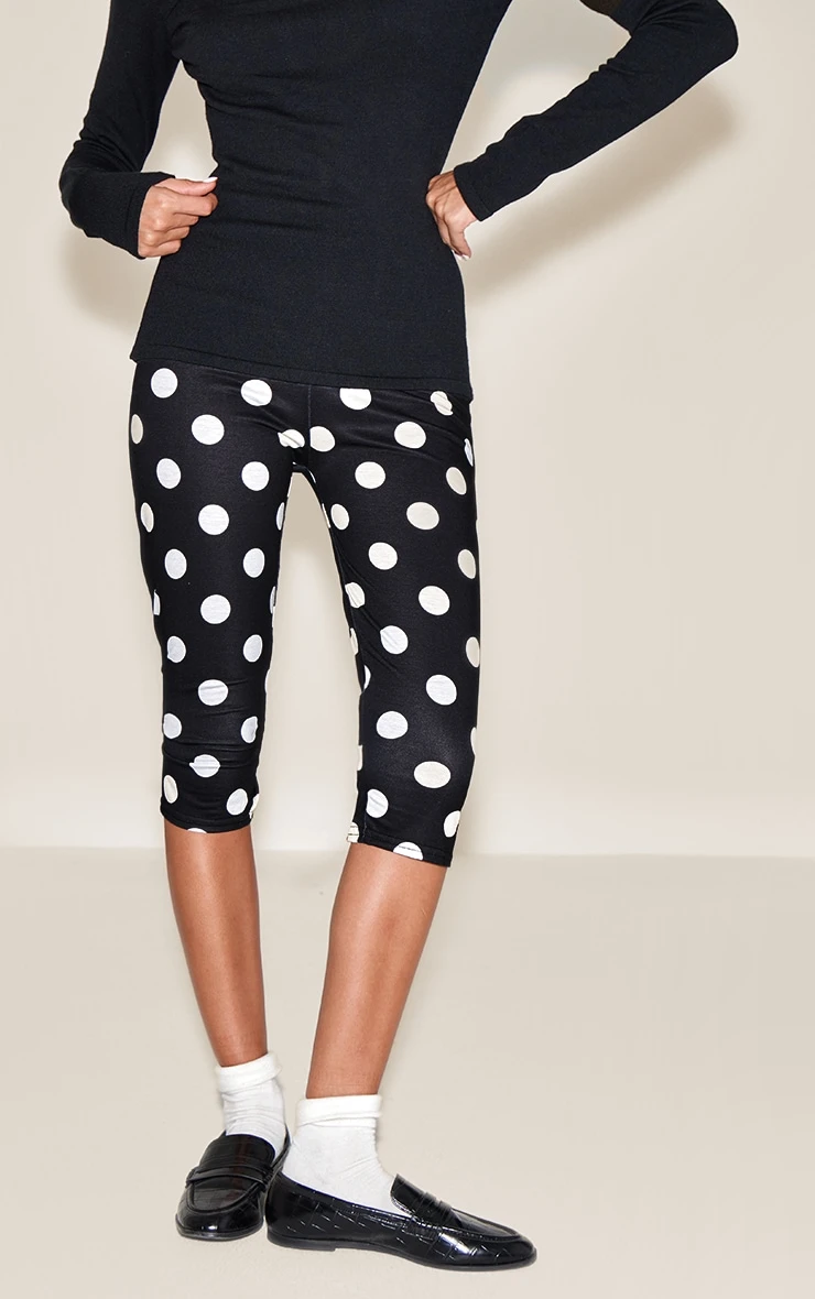 Make a statement with the black polka dot capri’s. Designed in a black fabric with playful polka dots, they feature a cropped length and fitted silhouette for chic appeal. Perfect for elevating day-to-night looks, these capris strike the perfect balance. Style with kitten heels and gold earrings for timeless charm.