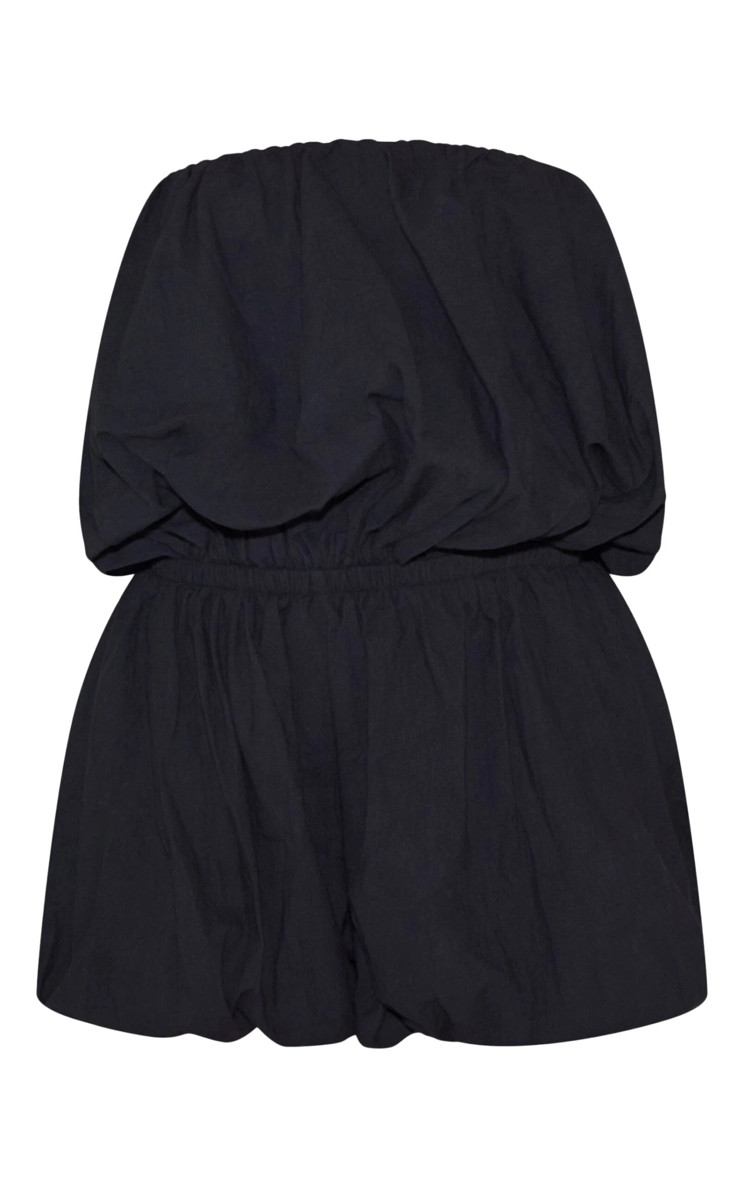 Step into effortless glam with the black puffball detail bandeau romper. Designed with a structured puffball hem and clean bandeau neckline, style it with chunky gold earrings and lace-up heels for a chic party vibe.