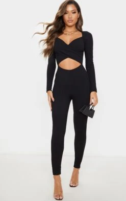 This black rib cross-over jumpsuit is a masterclass in minimalist dressing, offering a streamlined silhouette with an edge. The ribbed knit construction provides subtle texture and a comfortable stretch, while the cross-over neckline adds a directional detail. Its long sleeves make it a versatile choice for transitional weather. Consider accessorising with sculptural earrings from our jewelry collection to elevate the look.