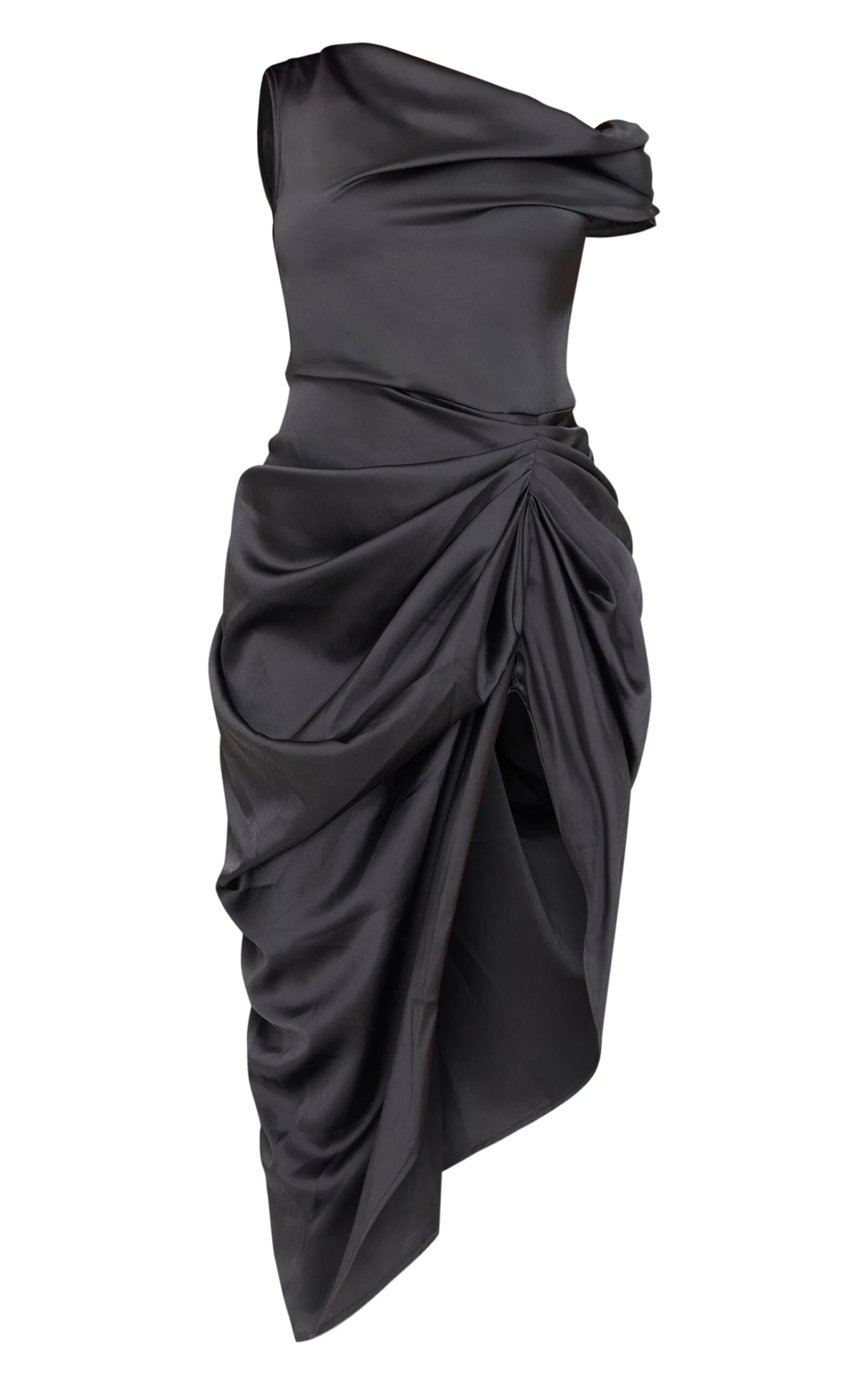 Consider this your sartorial RSVP to every upcoming occasion. The black satin midi dress is a masterclass in after-dark dressing, reimagined with a contemporary edge. The off-the-shoulder neckline frames the décolletage with understated elegance, while the draped skirt adds a touch of subtle drama and movement. Crafted in a sleek satin, this piece offers an elevated take on evening wear. Style yours with a delicate chain necklace from our jewelry collection to complete the look.