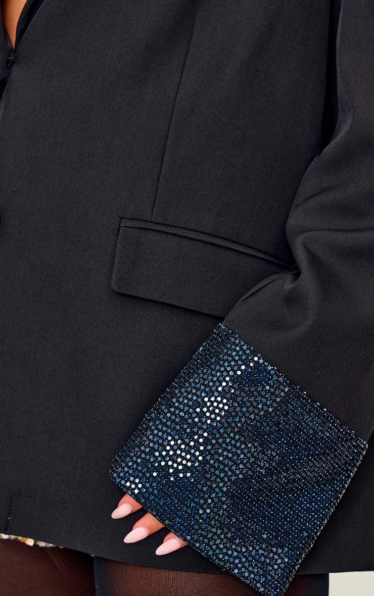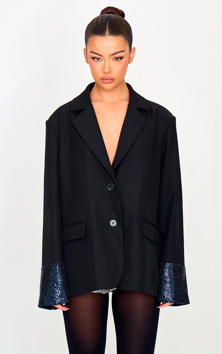 Consider this blazer your new after-dark essential. The sleek black tailoring gets a subversive update with statement sequin sleeves, creating an elevated take on a classic silhouette. Structured for a sharp, confident fit, this piece commands attention without sacrificing sophistication. Style yours with tailored pants from our bottoms collection for a modern take on evening power dressing, and add delicate gold hoops for a refined finish.