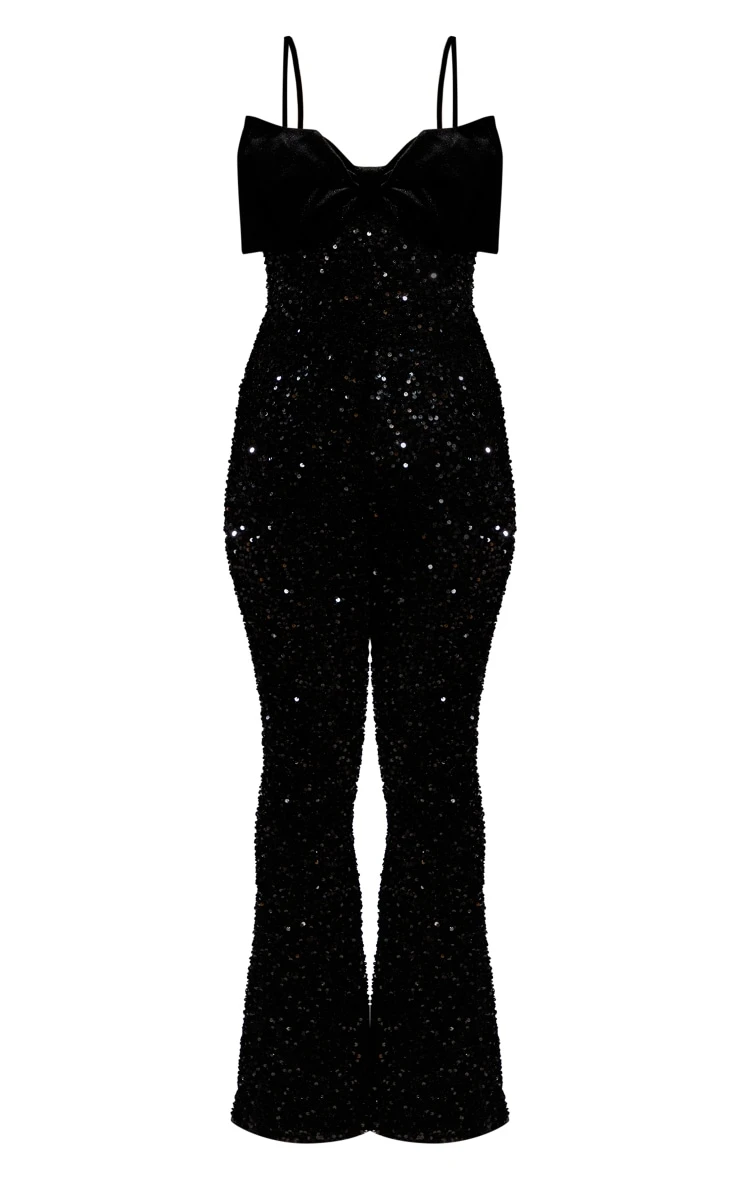 This luxe jumpsuit is sure to add some flare to your collection. Featuring a black sequin material with a strappy design, a velvet bow and a flared leg, we are in love. Pair with high heels, accessories and a shoulder bag for a combo that won’t go unnoticed.
